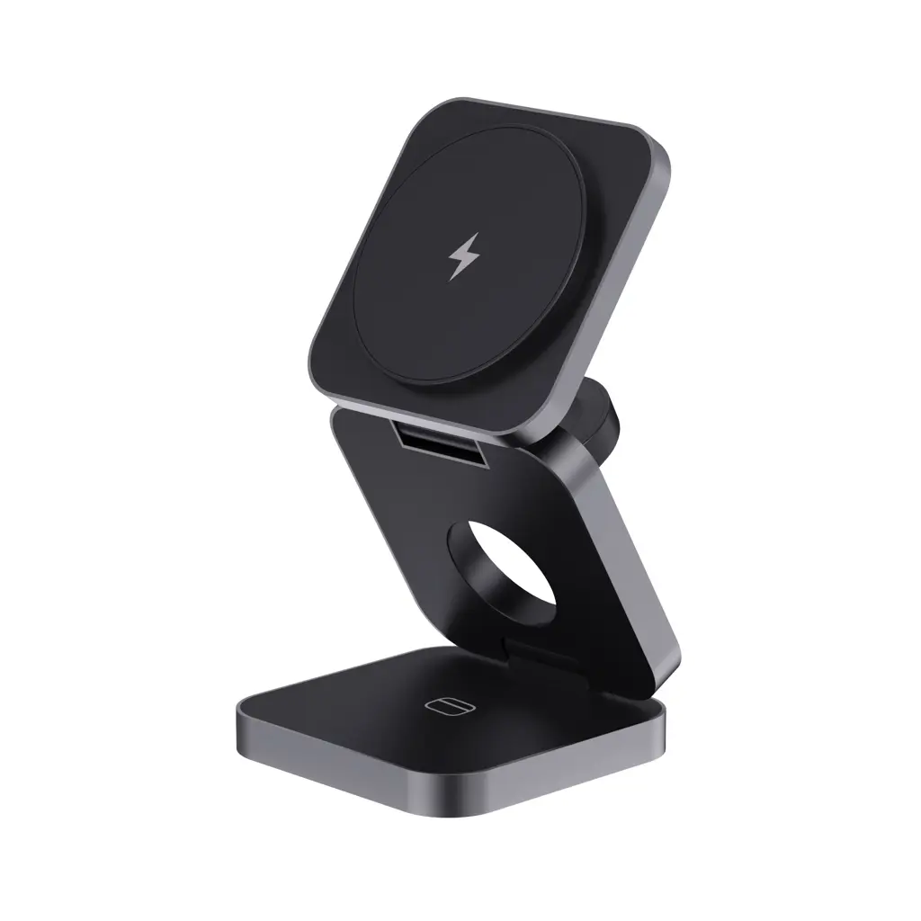 Sklopivi 3-u-1 bežični punjač izrađen od RCS recikliranog ABS-a i aluminija, ukupni udio recikliranog materijala 46% prema ukupnoj masi proizvoda, RCS certifikat jamči potpuno certificirani lanac opskrbe recikliranim materijalima, opremljen magnetskim 15W bežičnim punjačem, dodatnim 5W bežičnim punjačem za kutije za slušalice ili druge male uređaje i 2.5W bežičnim punjačem za pametne satove (samo Apple Watch), uključuje RCS certificirani 120 cm reciklirani TPE kabel, pakirano u FSC mix kraft ambalaži, proizvod i dodaci 100% bez PVC-a, ulaz 9V/3A, izlaz telefon 9V/1.1A ili 9V/1.67A (15W), slušalice 5V/1A (5W), sat 5V/0.5A, bez PVC-a