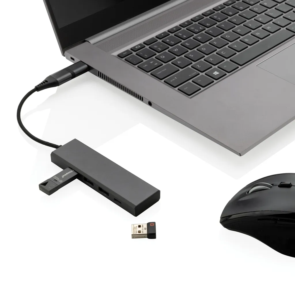 Aluminijski USB hub izrađen od RCS certificiranog recikliranog aluminija, ABS-a, TPE-a i PET-a s 3 USB A 2.0 priključka i jednim type C priključkom, integriranim kabelom duljine 10 cm od recikliranog RCS certificiranog TPE/PET materijala, ukupni udio recikliranog materijala 75% prema ukupnoj masi proizvoda, RCS certifikat jamči potpuno certificirani lanac opskrbe recikliranim materijalima, s dvostrukim ulaznim priključkom za korištenje na računalima s type C i USB A priključcima, aluminij se može beskonačno reciklirati bez gubitka svojstava, proizvod i dodaci su 100% bez PVC-a, pakirano u FSC mix ambalaži