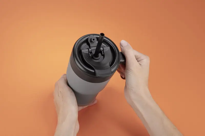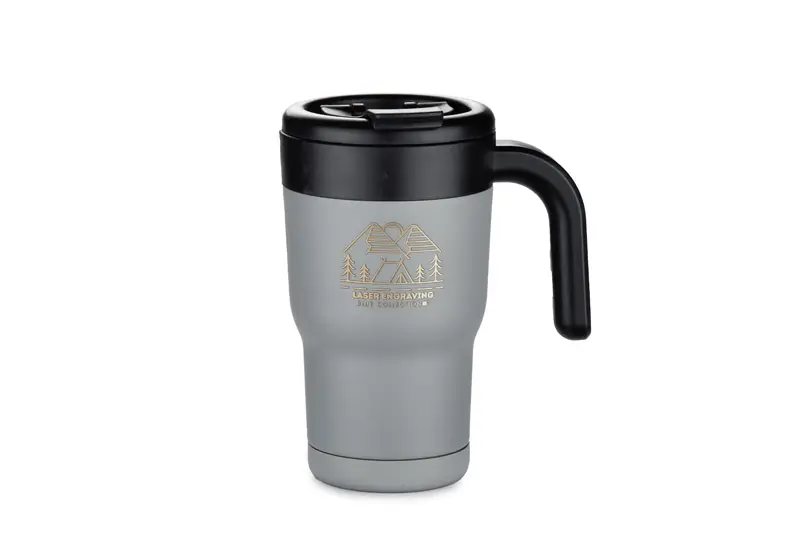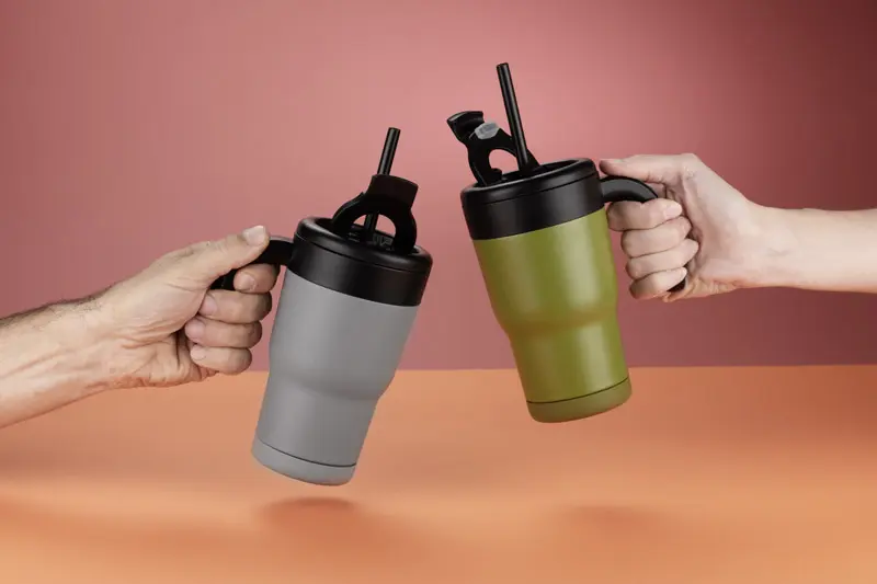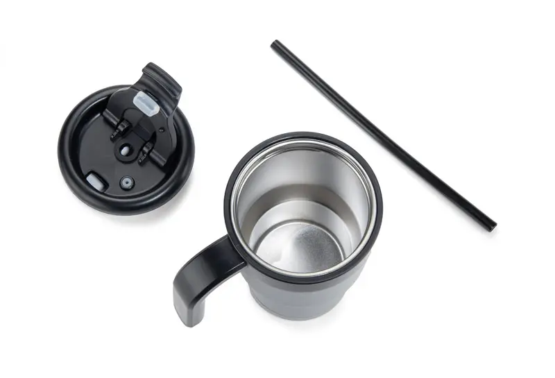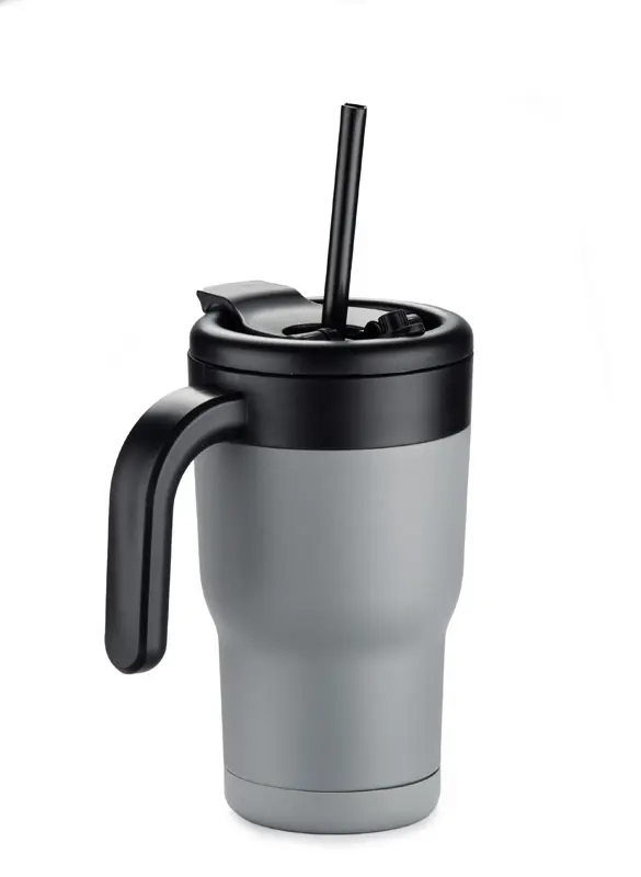 €15.50TUVO termo šalica od nehrđajućeg čelika zapremnine 530 ml, održava temperaturu pića do 5 sati, s ručkom, klasičnim izljevom i otvorom za slamku s fleksibilnim poklopcem, gumirana protuklizna podloga