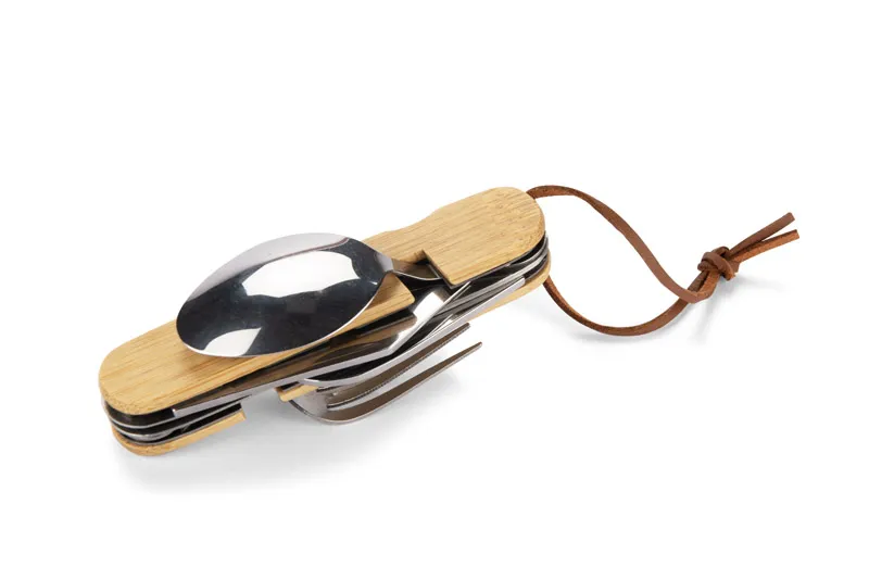 KENTO set putnog pribora sadrži nož, vilicu, žlicu, vadičep, otvarač za boce i odvijač u jednom, kućište od bambusa, s vezicom za pričvršćivanje na ruksak ili remen