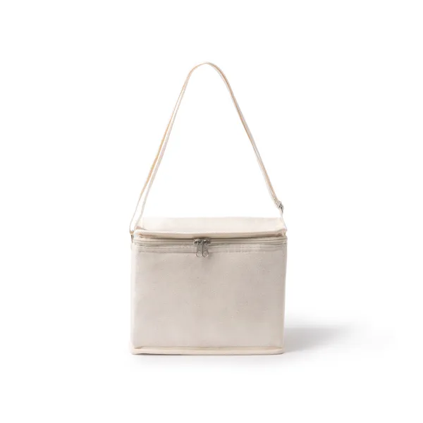 Cotton cooler bag with front pocket. Main pocket with isothermal lining. Carry handle included.
