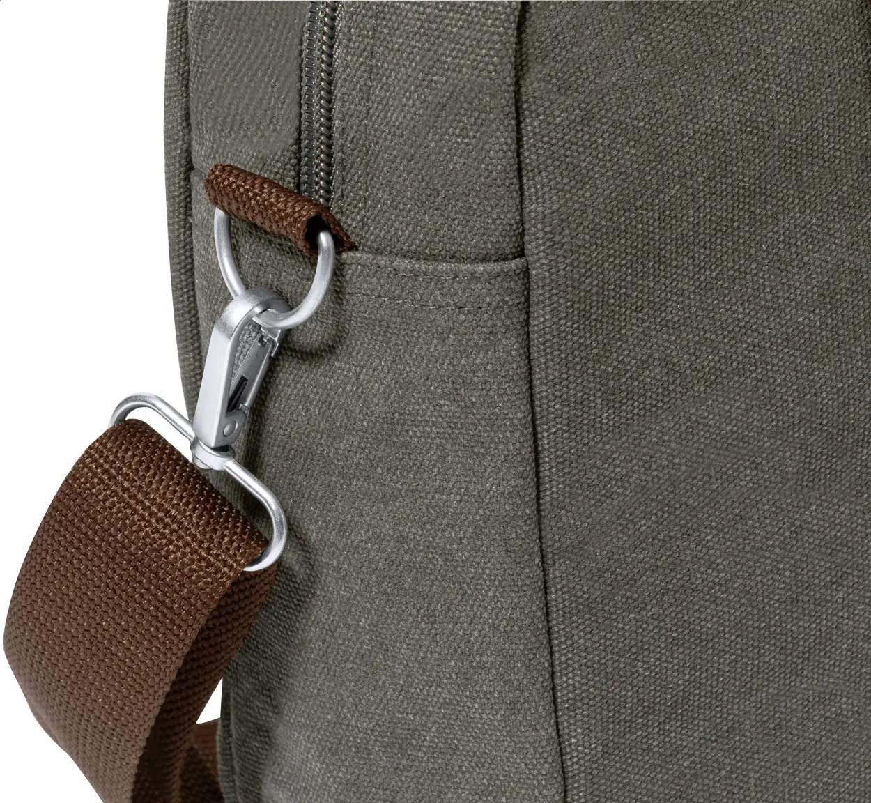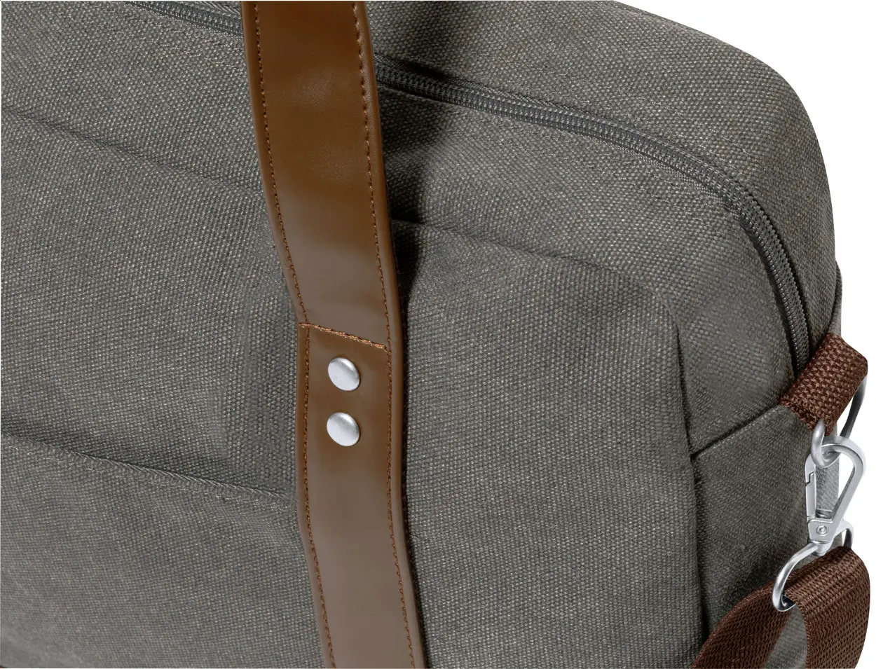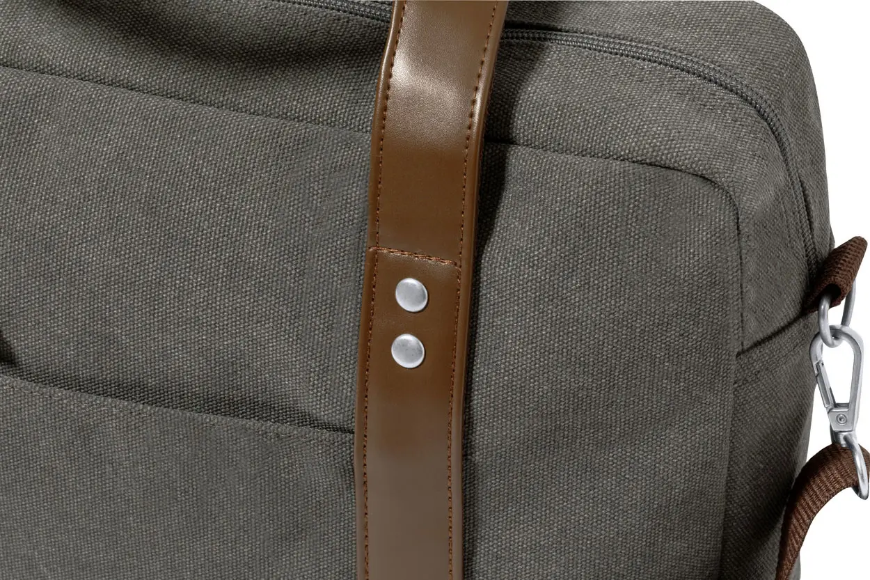 Torba za dokumente od platna s glavnim pretincem na patentni zatvarač i prednjim džepom, podstavljenim pretincem za laptop (15'') i tablet (10''), podesivi remen za nošenje preko ramena, detalji i ručke od PU kože