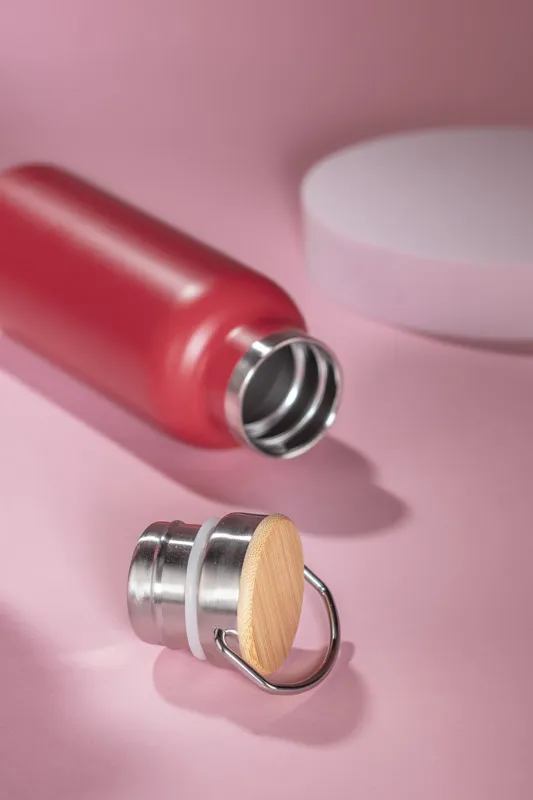 KAAN termo boca izrađena od visokokvalitetnog nehrđajućeg čelika, s ručkom i poklopcem s bambusovim završetkom, vakuum između stijenki održava temperaturu napitka do 10 sati