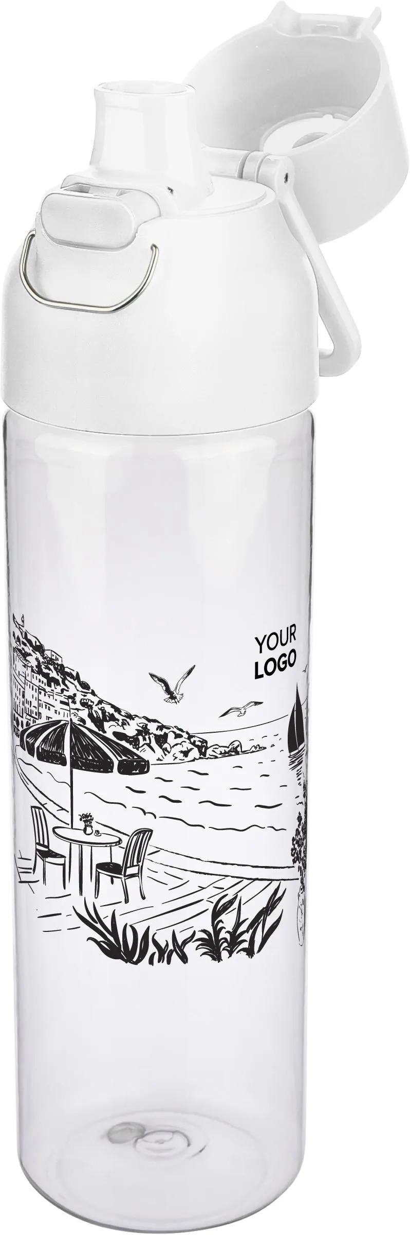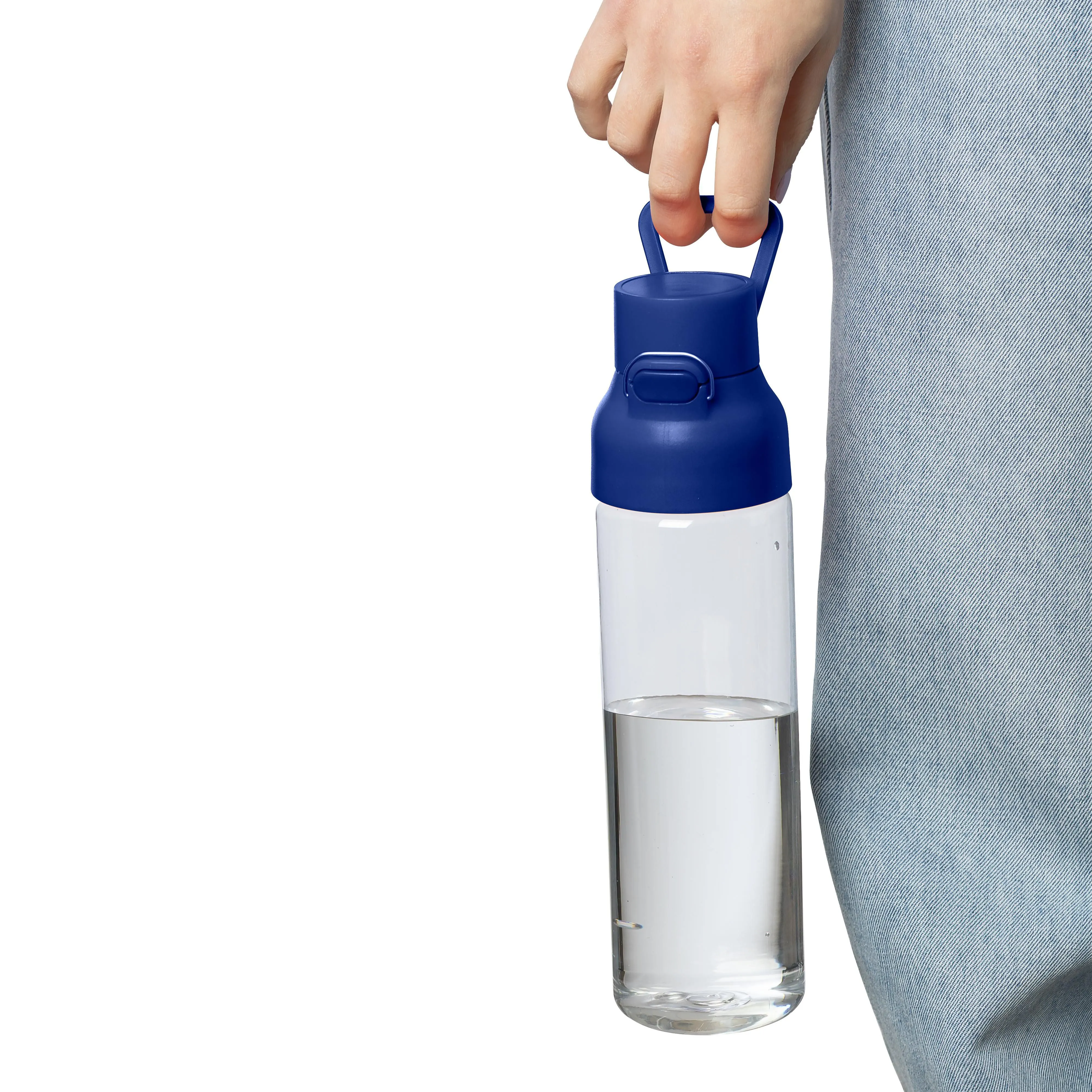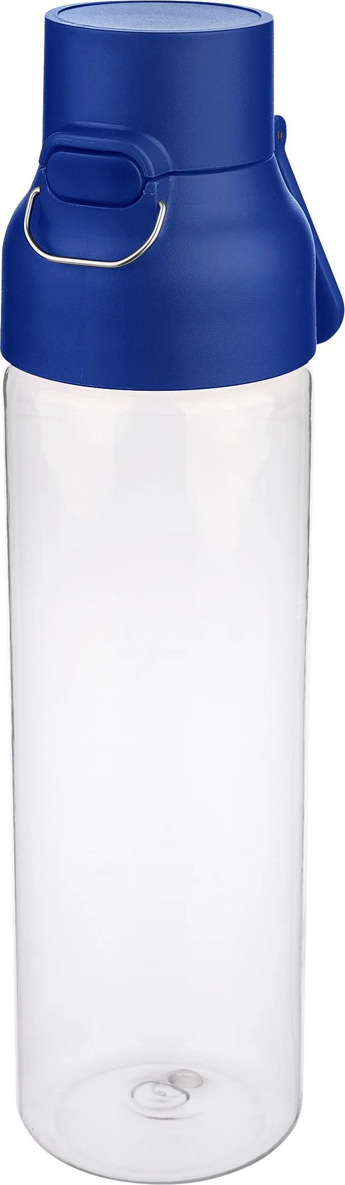 Tritan drinking bottle with 750 ml capacity, featuring a transparent body and colored lid. Made with durable, lightweight materials (PP) that resist moisture, chemicals, and everyday wear for long-lasting performance. Designed for daily use, it includes a secure button closure and a top carrying handle for easy transport. Suitable for work, school, or outdoor activities.