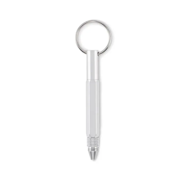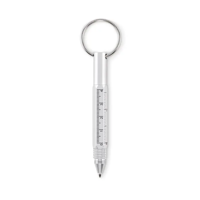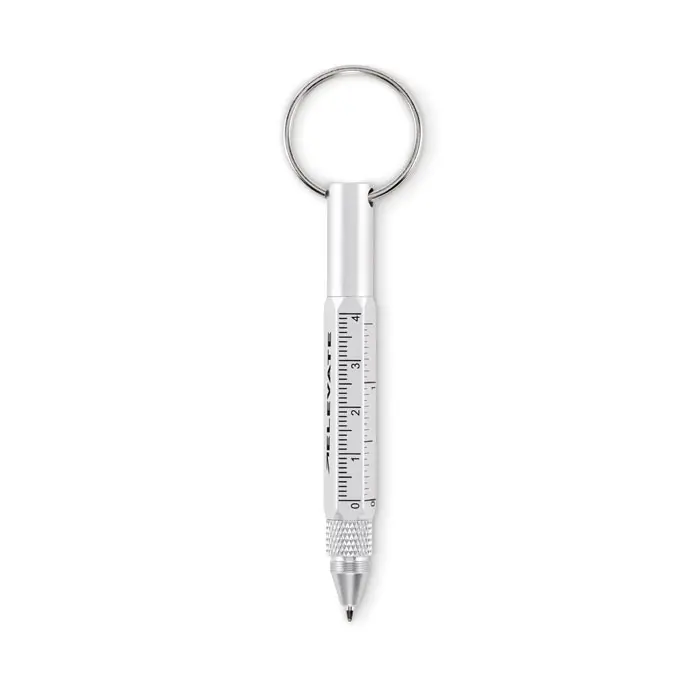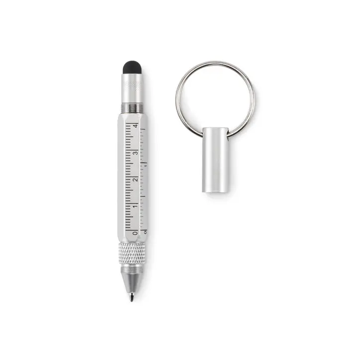 Prsten za ključeve s olovkom od recikliranog aluminija koja se otvara okretanjem, s ravnalom od 4 cm, stylusom i 2-u-1 Phillips i ravnom odvijaču. Crna tinta.