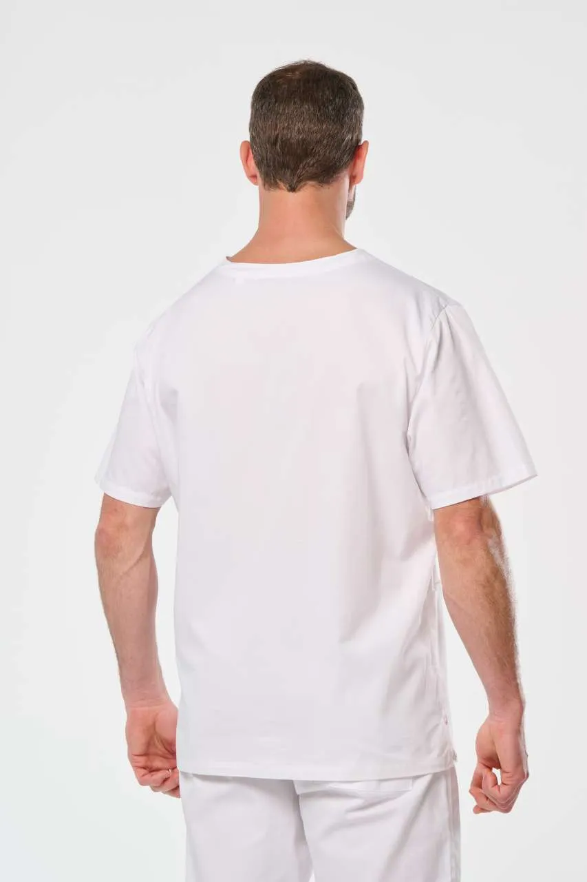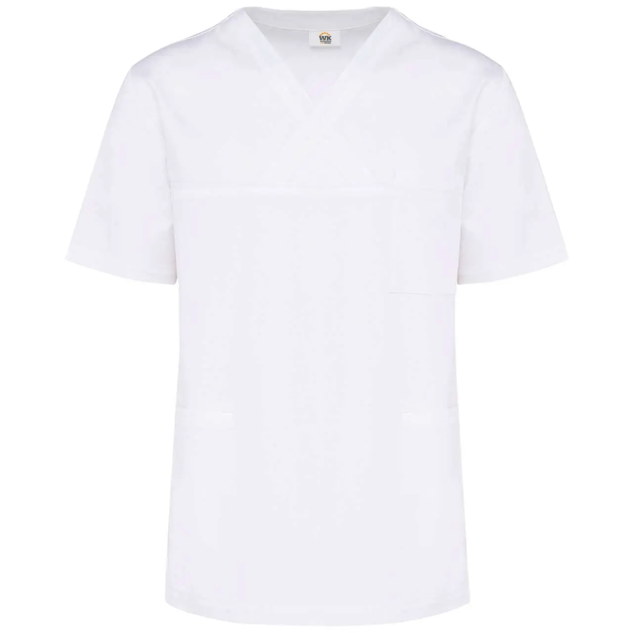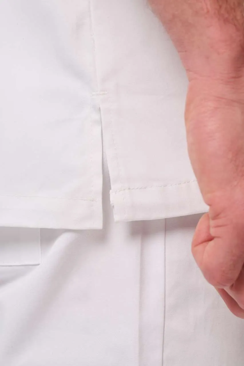 100% pamuk, keper tkanje, klasičan kroj, V-izrez s preklopom, našiveni džep na prsima s lijeve strane, 2 velika našivena džepa sprijeda, 2 proreza sa strane, unutarnja oznaka za ime, odvojiva etiketa brenda