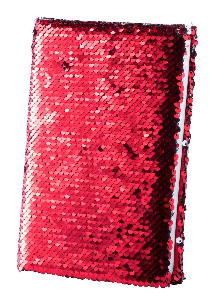 Bilježnica B7 veličine s poliesterskom presvlakom i šljokicama, 80 listova i oznaka za knjige u odgovarajućoj boji.