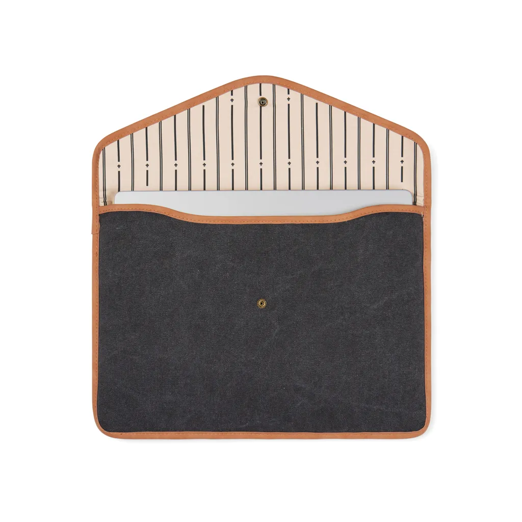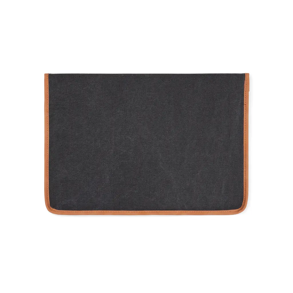 Navlaka za laptop iz Bosler serije izrađena od recikliranog platna s PU detaljima podstavljena i zatvara se na pritisni gumb GRS certifikat ukupni udio recikliranih materijala 37% reciklirani pamuk i 25% reciklirani poliester dimenzije prikaza mogu se razlikovati od dimenzija laptopa
