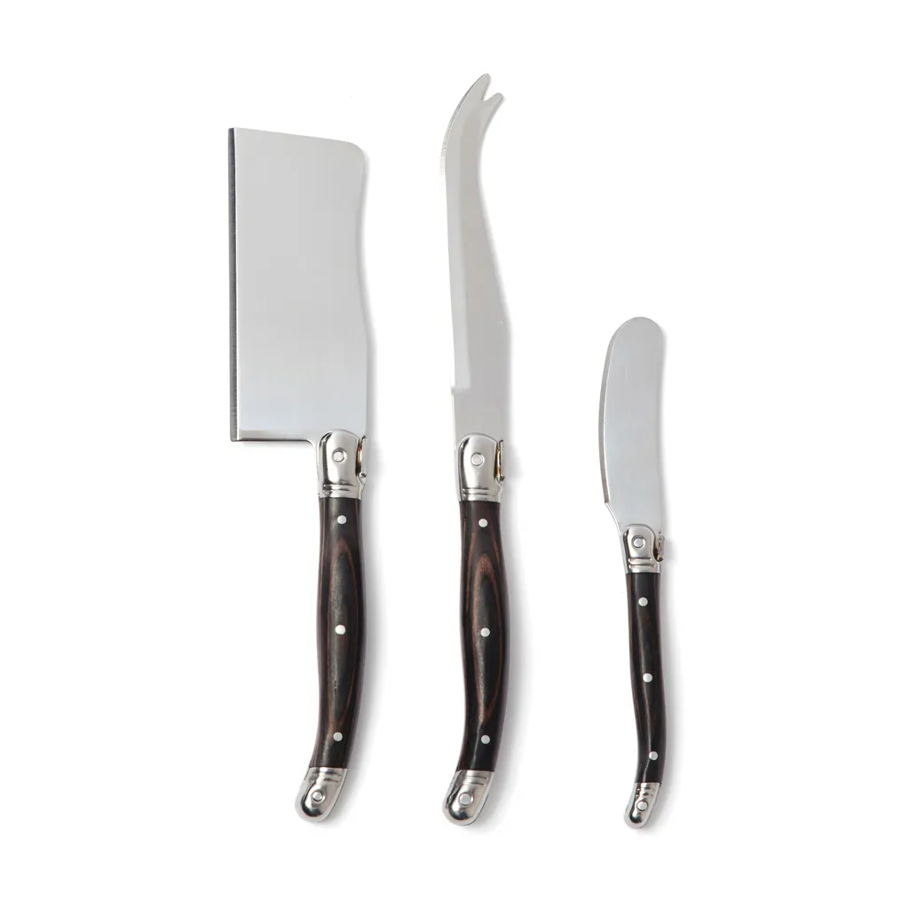 €15.65Ekskluzivni set noževa za sir od nehrđajućeg čelika s dvije vrste noževa za sir i nožem za maslac s crnom drškom od pakka drva pakirano u ekskluzivnom gift boxu