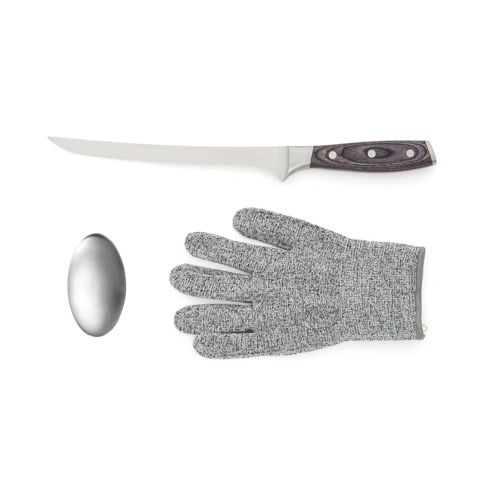 €27.61Set za filetiranje ribe koji se sastoji od noža za filetiranje, rukavice od čelične mreže i metalnog sapuna. Rukavica pruža dodatno prianjanje na ribu dok vas štiti od mogućih nezgoda. Metalni sapun uklanja mirise poput ribe i luka koje je teško ukloniti s drugim sapunima. Nož je napravljen od njemačkog čelika X50CrMoV15 s drškom od Pakkawooda. Drška koja se lako drži i izvrsna ravnoteža u oštrici čine nož udobnim i jednostavnim za rad. Veličina: oštrica od 21 cm.