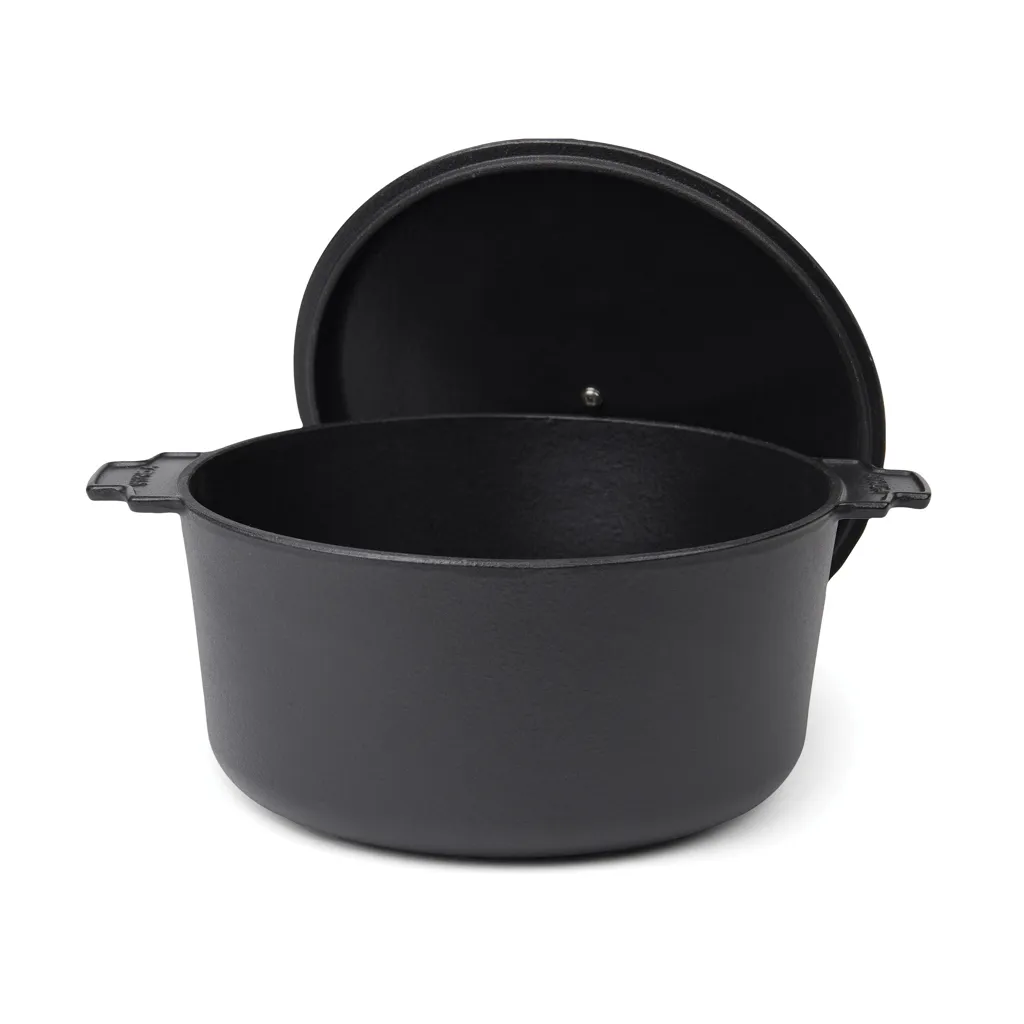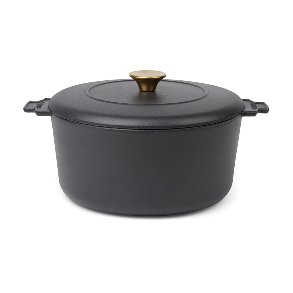 Lijevana željezna posuda s emajliranim premazom, mesingasta ručka, čvrste ručke za sigurno rukovanje, unutrašnjost razvija neljepljivu patinu, pogodna za sve vrste ploča uključujući indukciju, dugotrajna uz pravilno održavanje