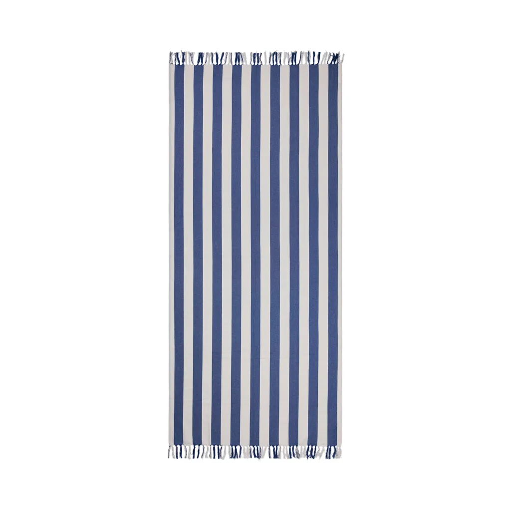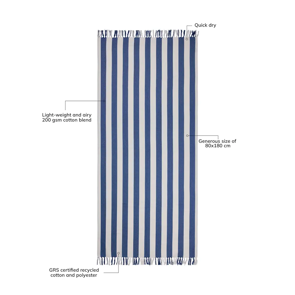 Hammam ručnik za plažu s dvobojnim prugastim uzorkom i resama na kraćim stranama, izrađen od lagane mješavine 200 g/m² pamuka i poliestera, dimenzije 80x180 cm, sadrži 68% GRS certificiranog recikliranog pamuka i 29% GRS certificiranog recikliranog poliestera