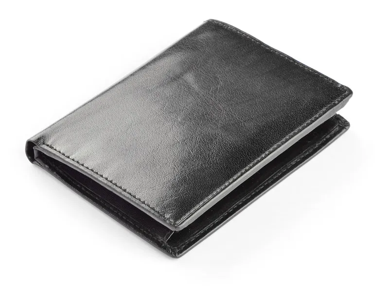 Kožni novčanik s pretincem za kovanice, 2 pretinca za novčanice, 4 utora za kartice, 5 pretinaca za dokumente i jednim pretincem s patentnim zatvaračem, isporučuje se pojedinačno u drvenoj kutiji, sadrži zaštitnu foliju za blokiranje RFID signala radi zaštite podataka s kartica