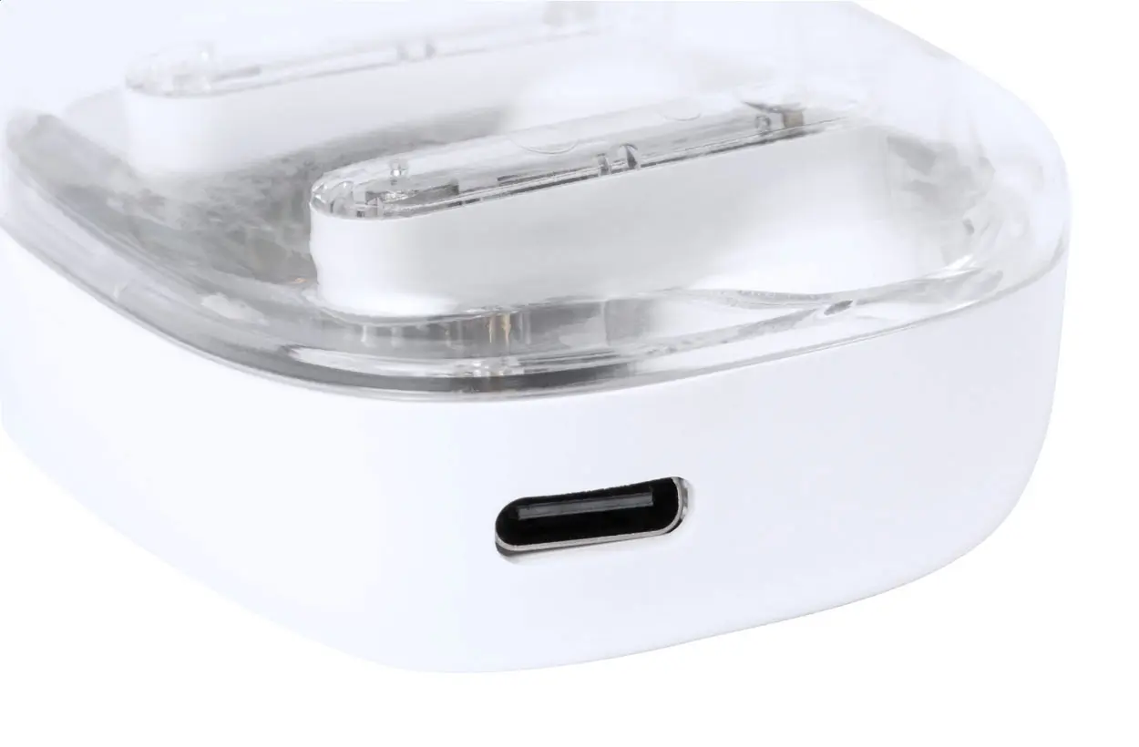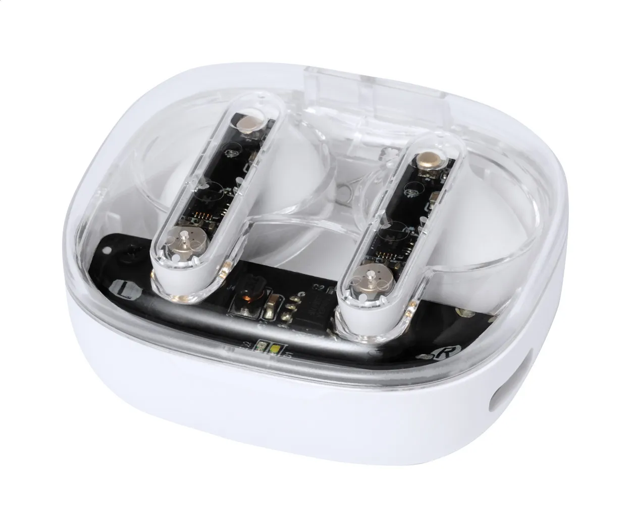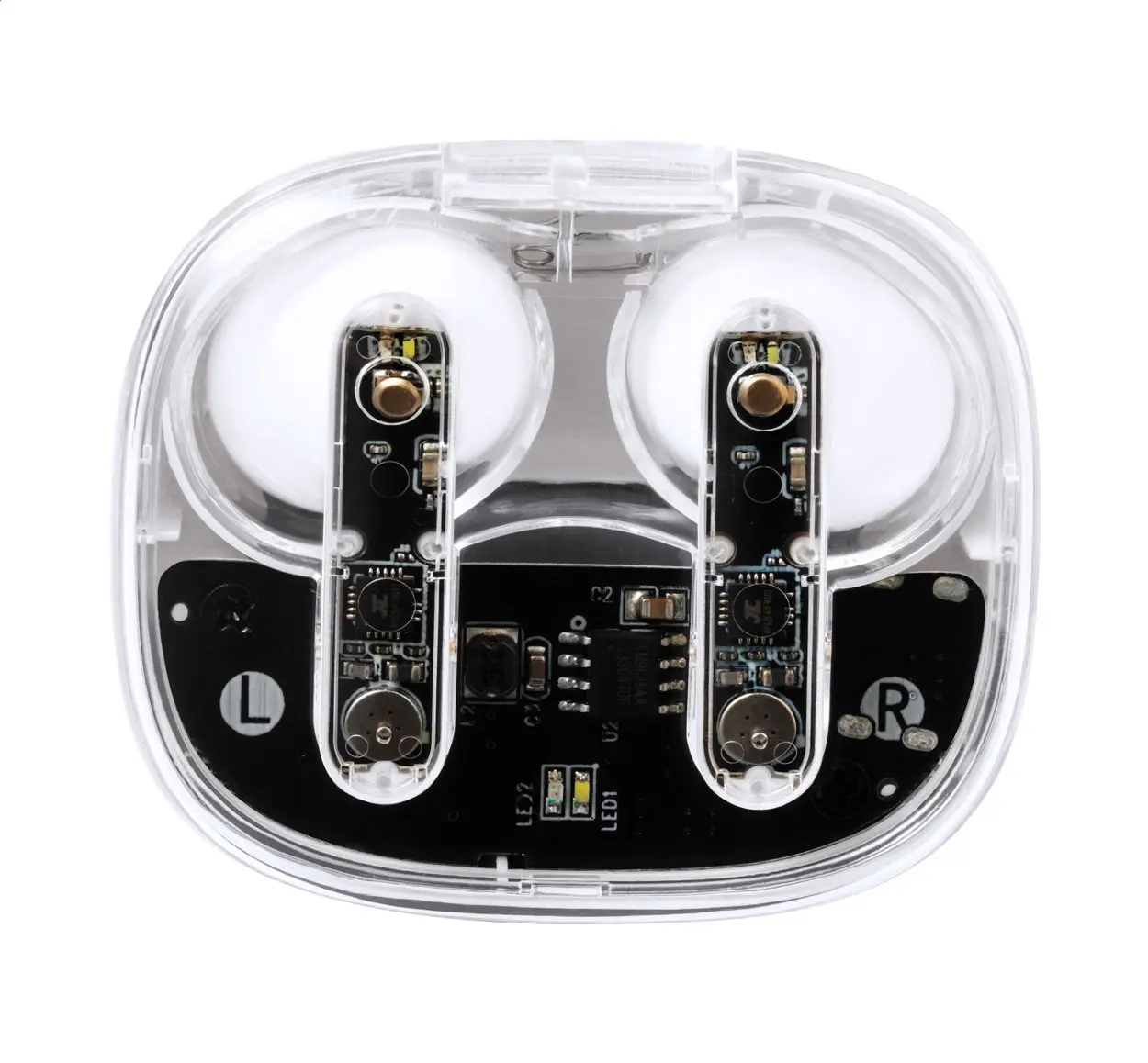 Poluprozirne bežične bluetooth slušalice s vidljivim elektroničkim komponentama i funkcijom hands-free poziva, u poluprozirnoj plastičnoj kutiji za punjenje, uključuje USB kabel za punjenje