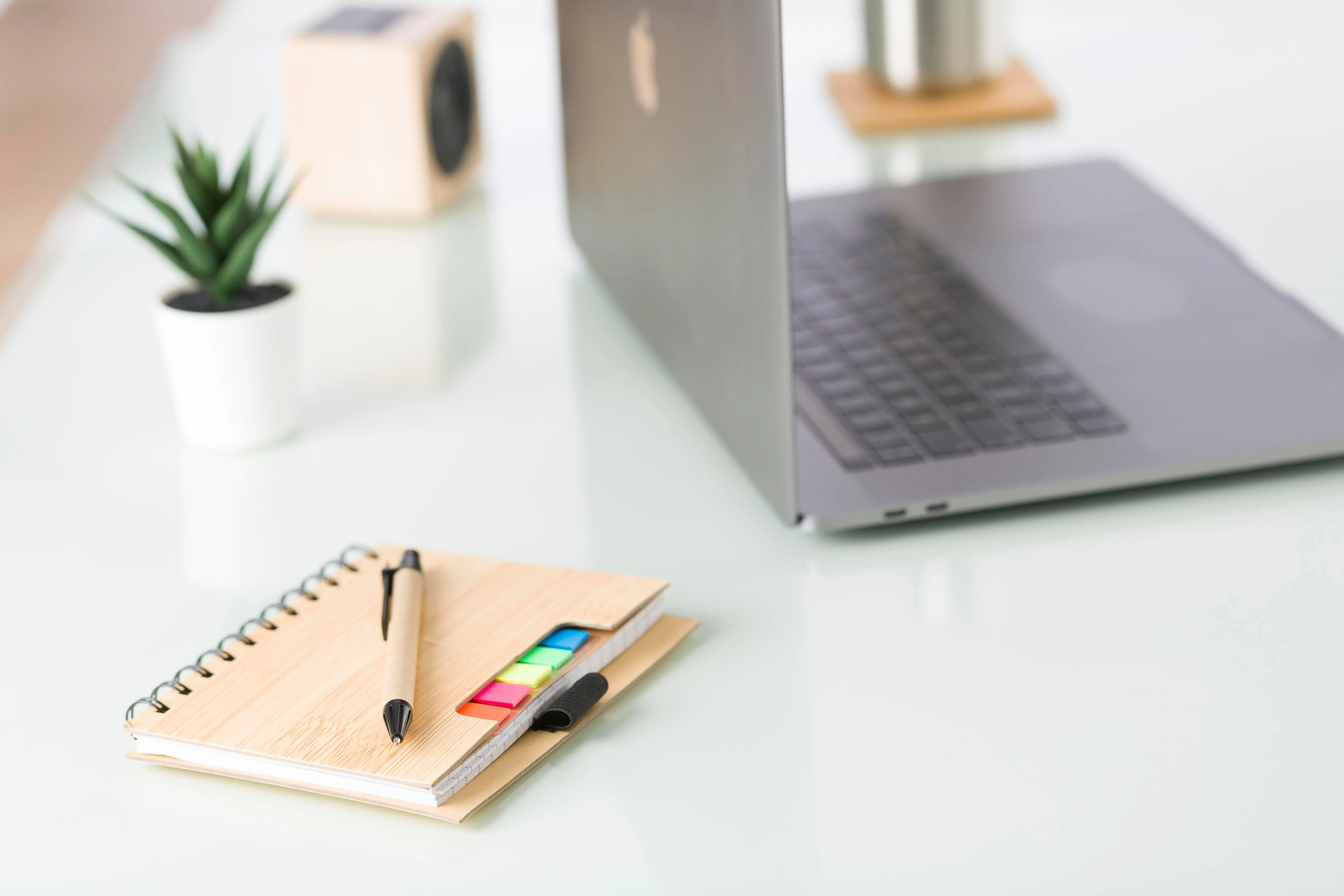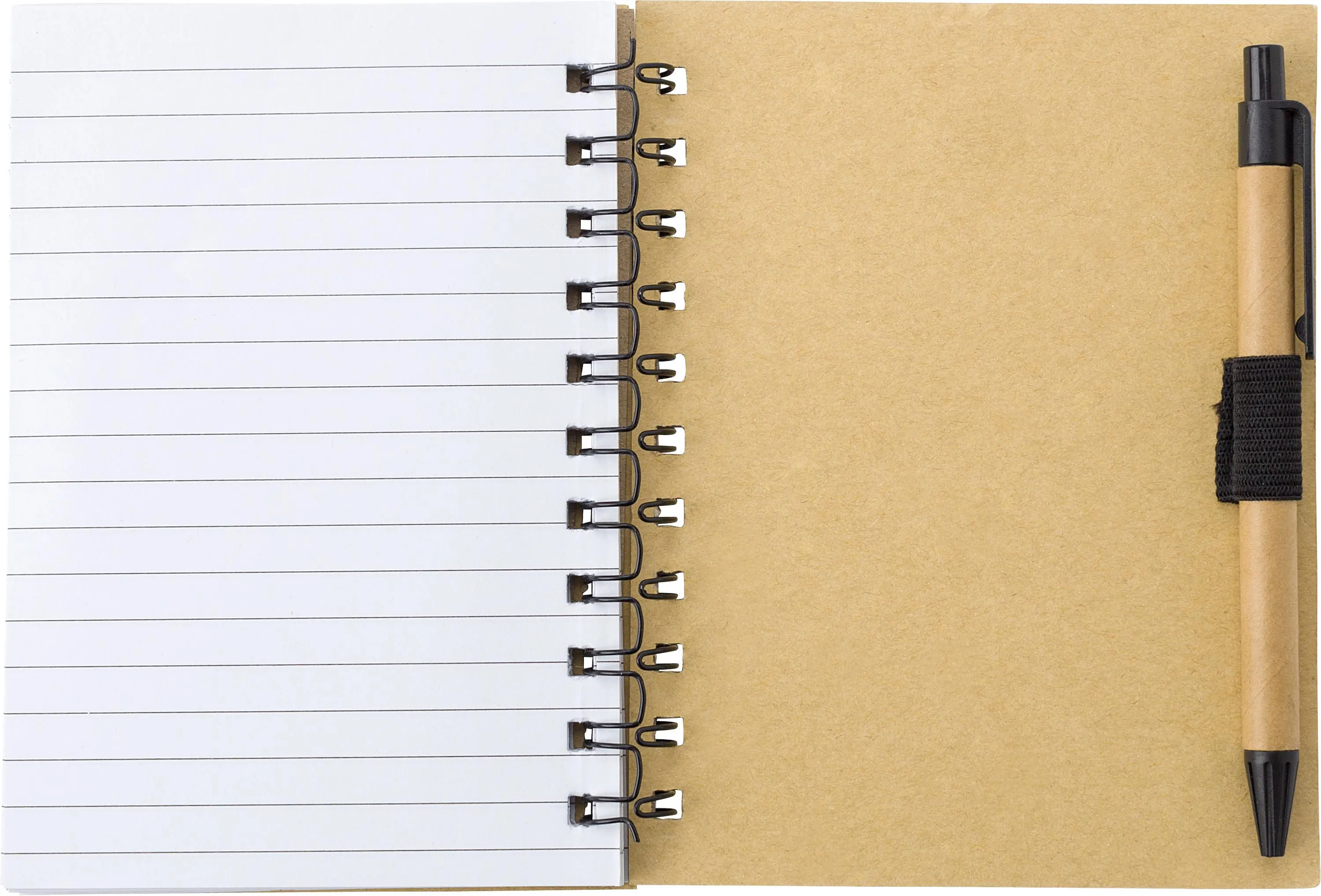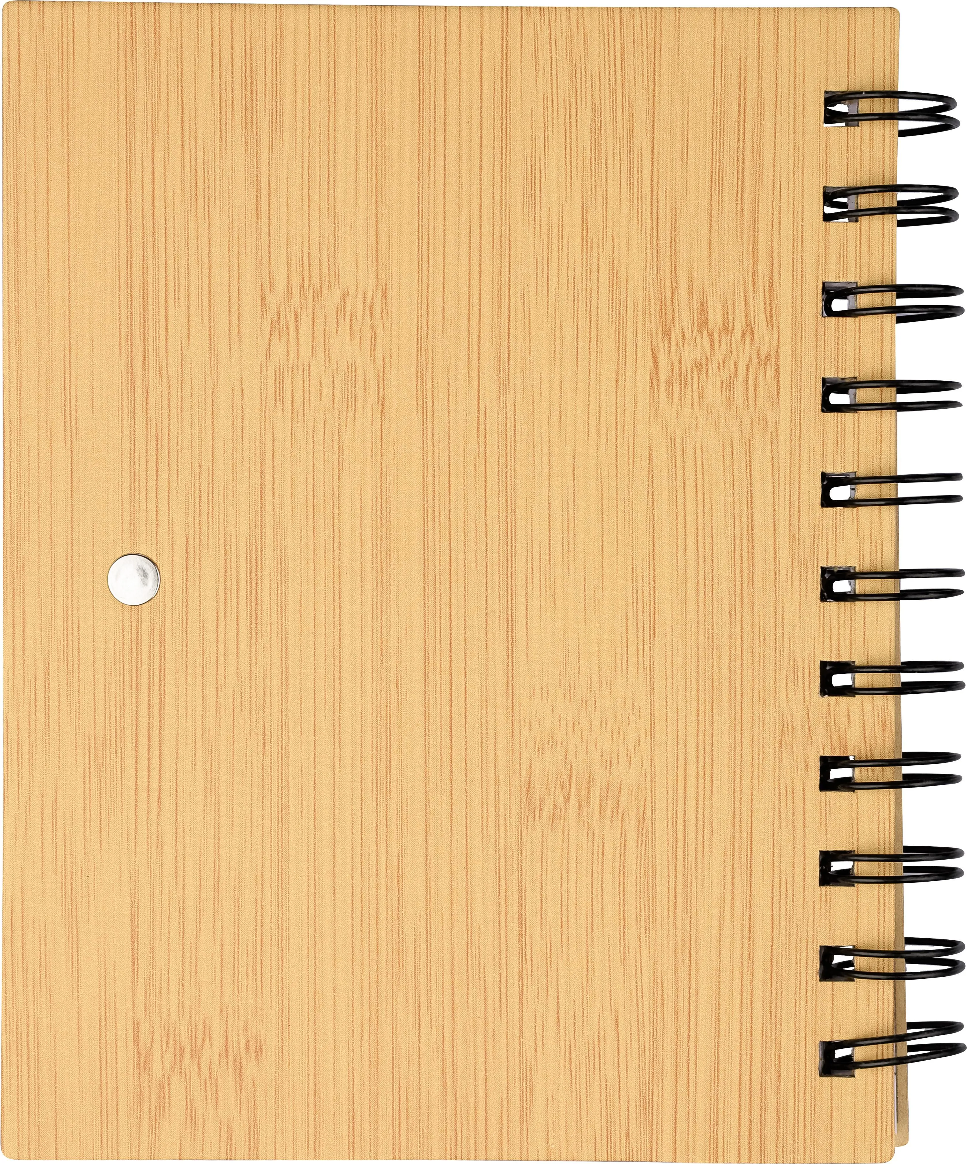 Bamboo look notebook, wire bound, 70 lined pages, mulitple colors of sticky notes and ballpen with blue ink. The paper in this notebook is FSC® Mix certified.
