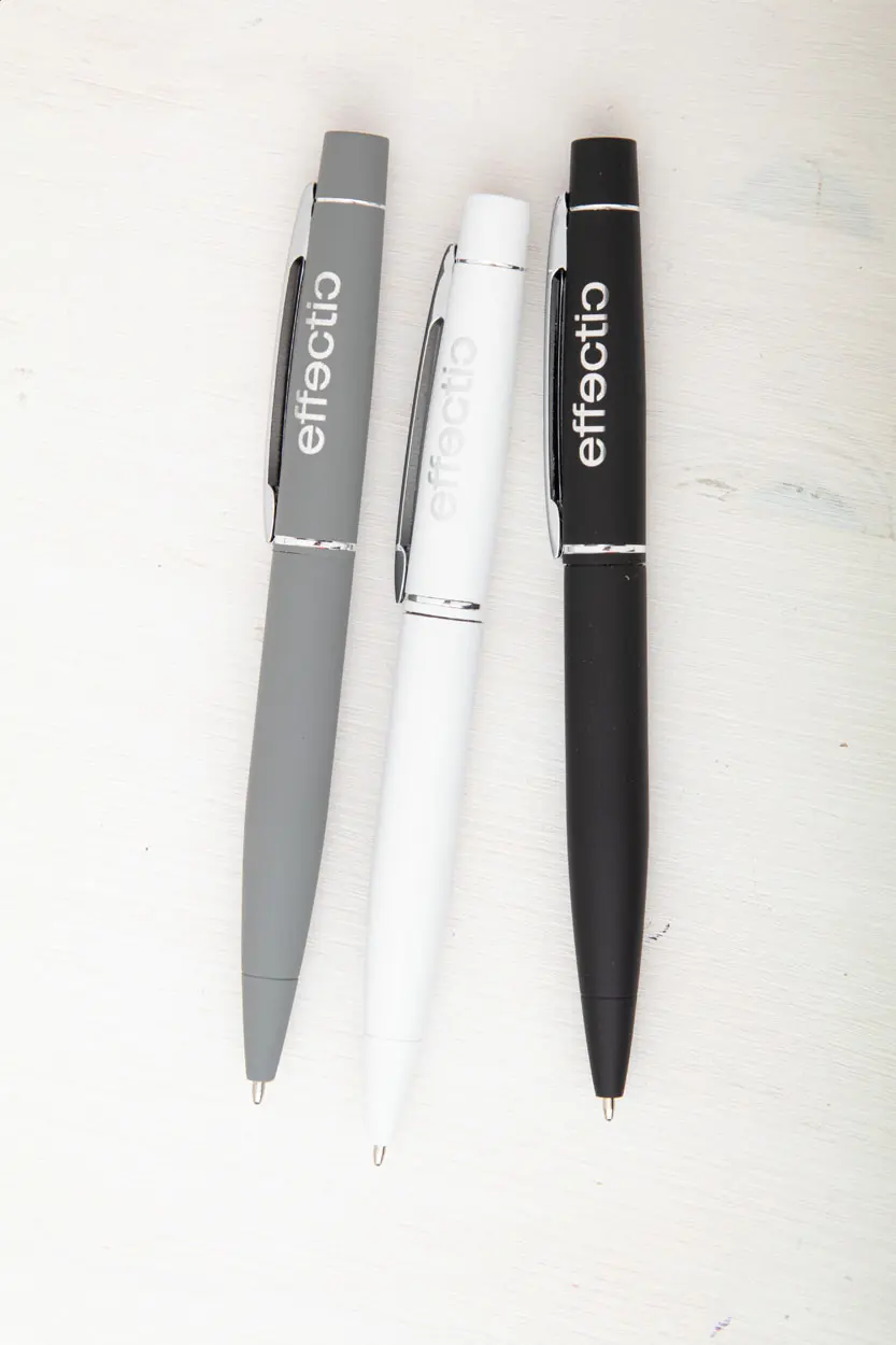 €2.78Metalna kemijska olovka s mehanizmom za uvrtanje, gumenom završnicom i plavim punjenjem. S posebnim premazom za lasersko graviranje u ogledalo.