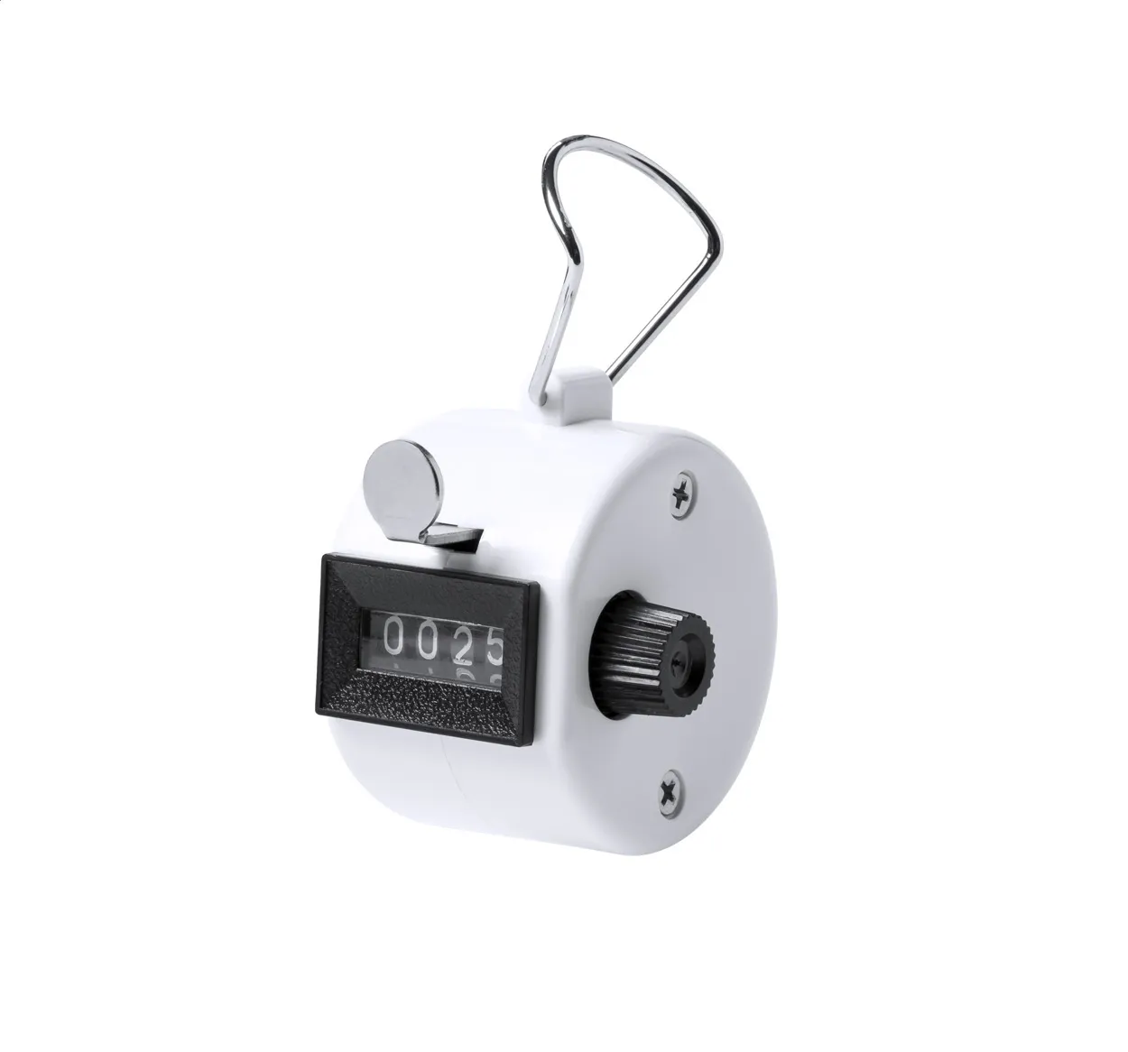 Analogni brojač u plastičnom kućištu s brojačem na 4 znamenke, bočnim gumbom za resetiranje, metalnim držačem za prst i gumbom za pritisak