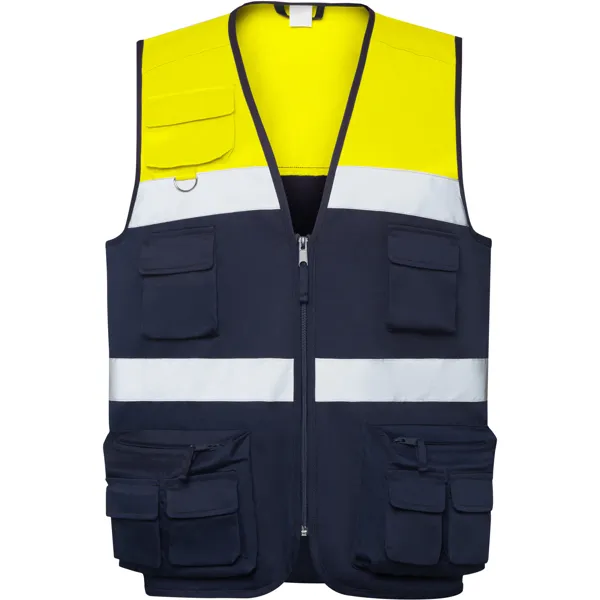 €14.96Dvobojni prsluk visoke vidljivosti s više džepova, dvije vodoravne reflektirajuće trake, V-izrez, prednji patentni zatvarač s povlačnikom, gornji desni džep s metalnim prstenom, dva džepa s preklopom i čičak trakom između reflektirajućih traka, dva bočna džepa na patentni zatvarač s dva preklopna džepa s čičak trakom, dva stražnja džepa s preklopom i čičak trakom, obrubljeni rubovi s tkaninom u boji, vanjska Roly WRK etiketa, do 25 ciklusa pranja