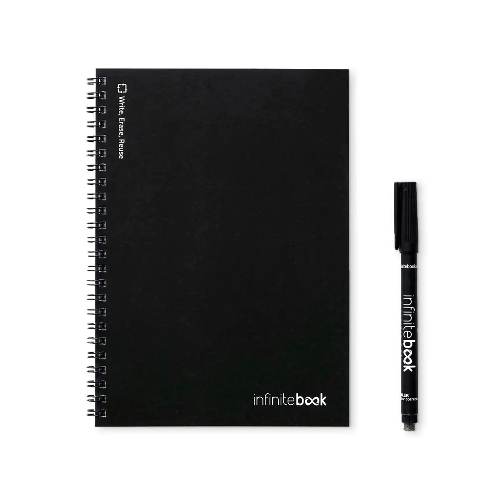 €10.95A5 bilježnica - "Infinitebook" - s fleksibilnom koricom i prstenima u odgovarajućoj boji. Sadrži 15 stranica u stilu bijele ploče i crni marker. Ova bilježnica omogućuje jednostavno pisanje i brisanje te je praktično rješenje za smanjenje potrošnje papira. Bilješke se mogu skenirati. Proizvedeno u Europi. Isporučuje se u omotnici od kraft papira s naljepnicom. 148 x 210 mm.
