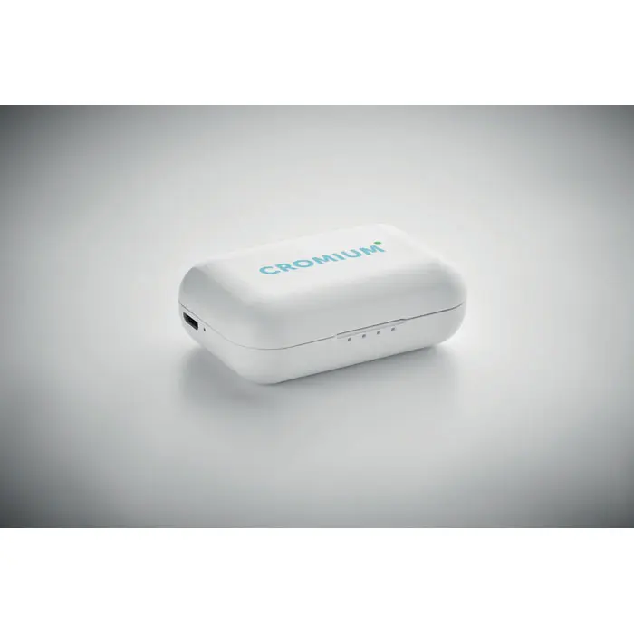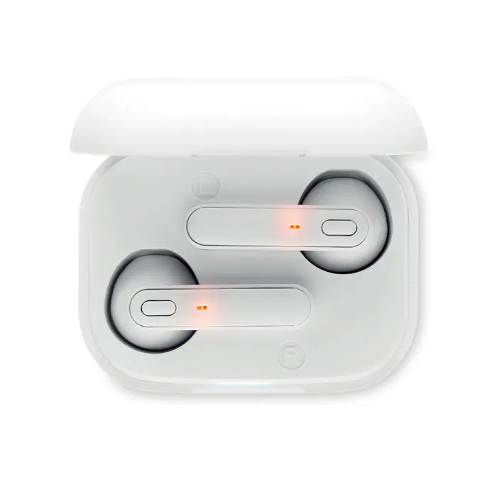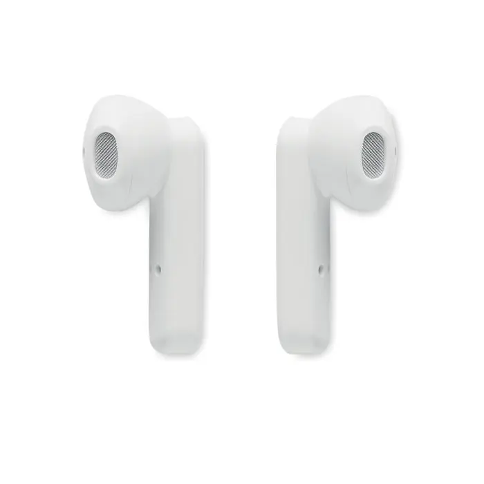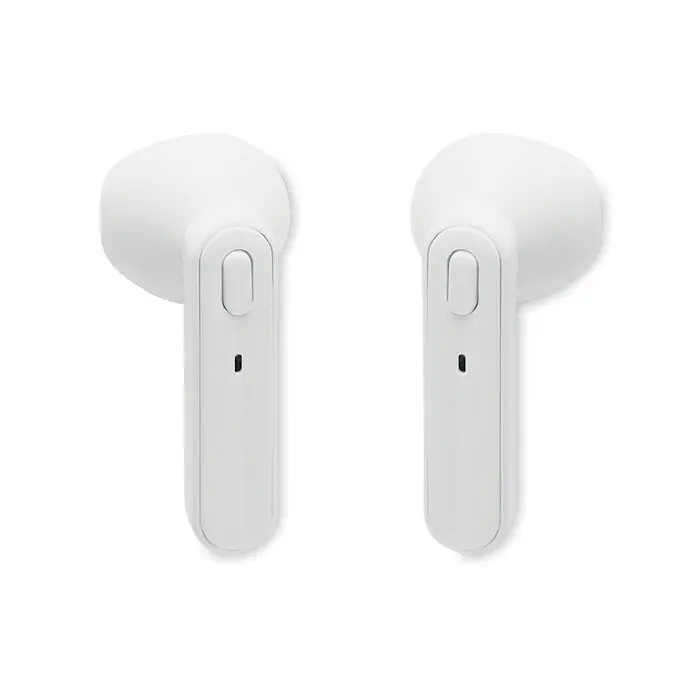 Set od 2 True Wireless Stereo (TWS) 5.3 slušalice s mikrofonom i ugrađenom baterijom od 30 mAh. Vrijeme reprodukcije otprilike 3 sata. Automatsko spajanje. Uključuje mikro USB kabel za punjenje i stanicu za punjenje od 185 mAh. Izrađeno od recikliranog ABS-a.