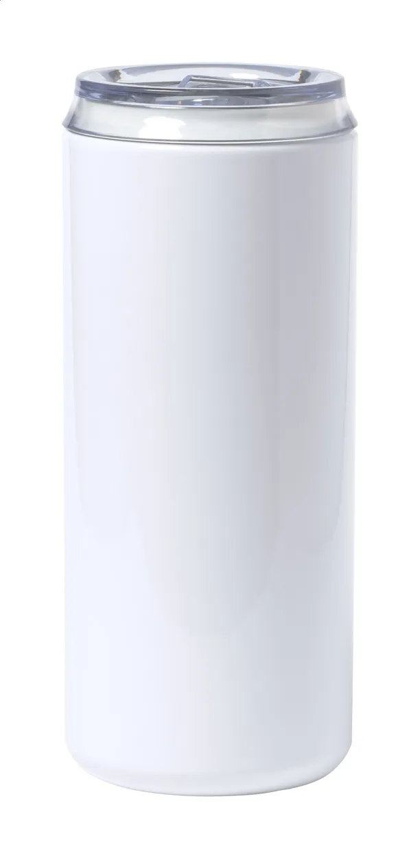 Can-shaped, double-wall stainless steel thermo mug for sublimation printing with transparent drinking lid. 650 ml. Insulation keeps drinks hot for 12 and cold for 48 hours.