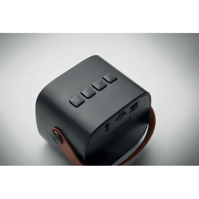 €6.455.0 bežični zvučnik od recikliranog ABS-a s PU ručkom uključuje punjivu Li-ION bateriju 500 mAh utor za SD karticu i AUX/USB kabel izlazna snaga: 5W, 3 Ohm i 5V vrijeme reprodukcije cca 4 sata