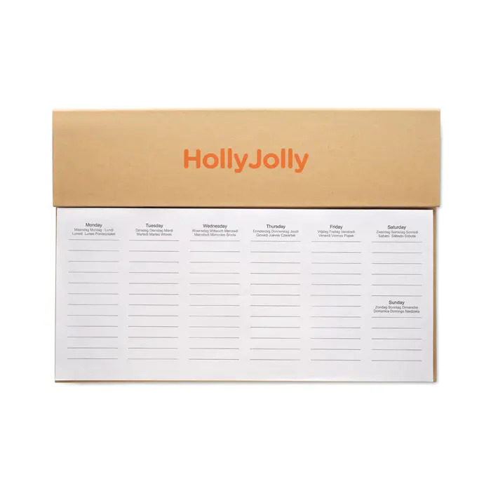 Tjedni stolni planer sa 125 listova na 6 jezika (EN/DE/FR/ES/IT/NL/PL) s koricama od kraft papira, plavom kemijskom olovkom s plastičnim klipom i kartonskim tijelom, drvenim ravnalom i samoljepljivim blokićem