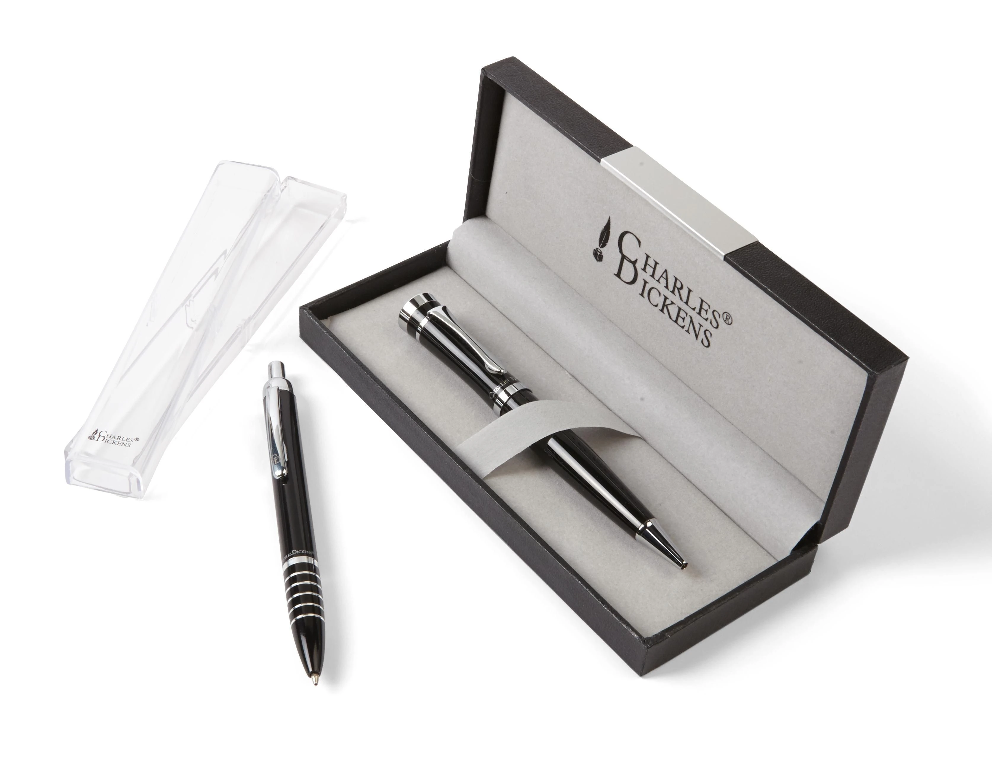 €11.14Charles Dickens® metalna kemijska olovka sa srebrnim detaljima i mehanizmom na okretanje, pakirana u luksuznoj kutiji za olovke, crna tinta