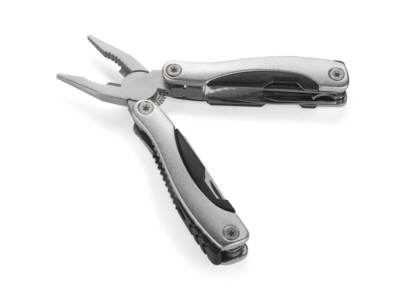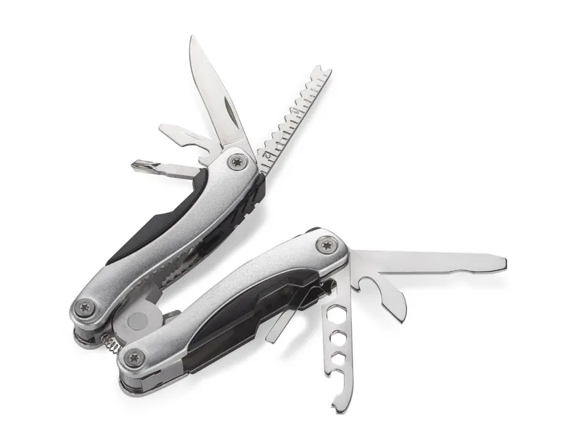 WORK alat je višenamjenski džepni alat s funkcijama: kliješta, rezač, nož s ravnom oštricom, pila, turpija, ravni i križni odvijač, otvarač za boce i konzerve te tri veličine ključeva, set uključuje crnu torbicu od Oxford tkanine