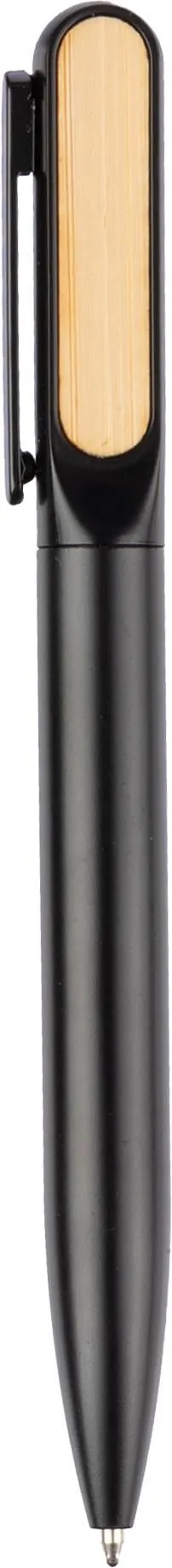 an aluminium twist ballpen with a matte finish, blue writing, and a bamboo detail on the clip