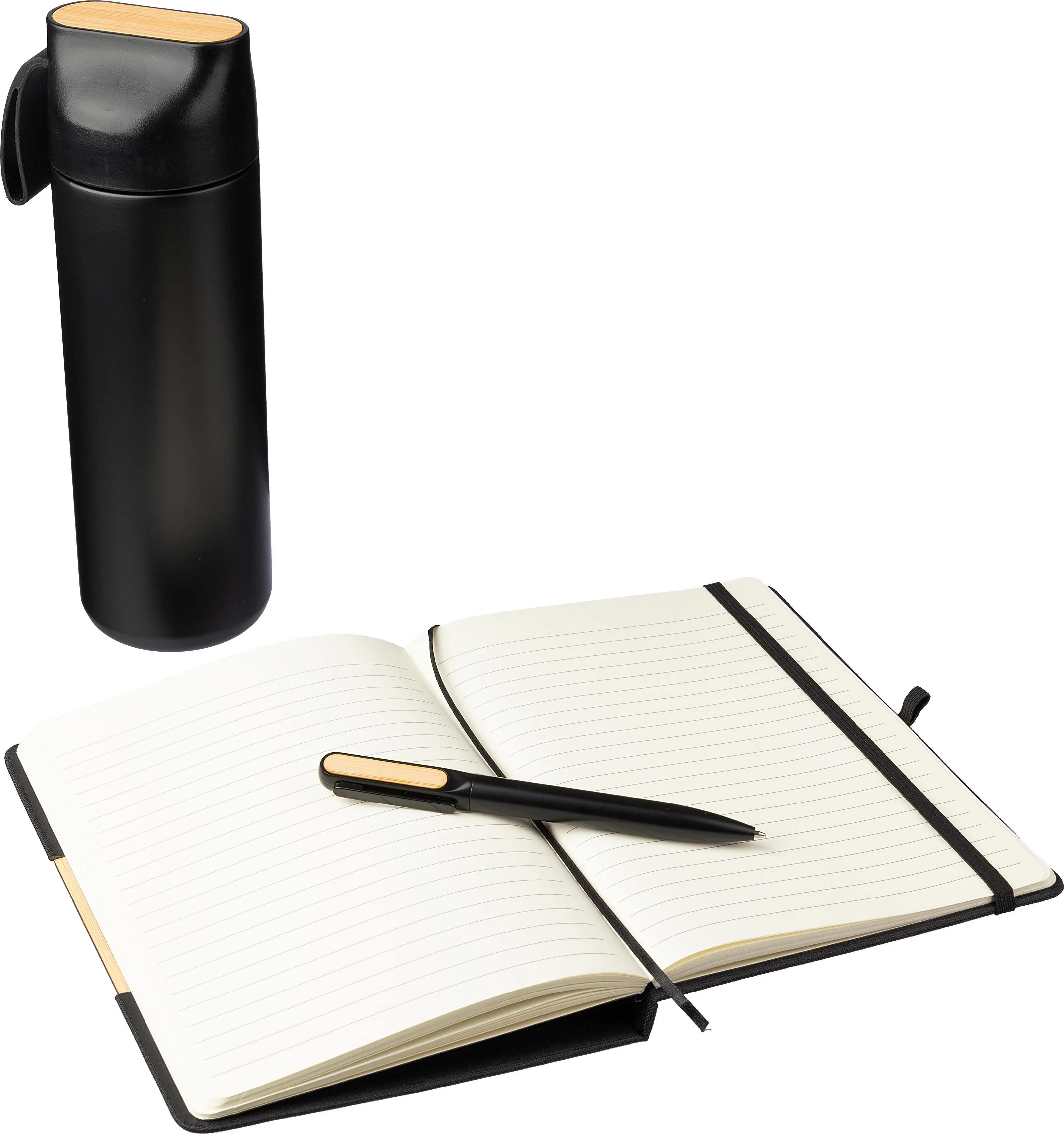 and an rPET (300D) notebook (approx. A5) with 80 lined pages and a foldable cover turning into a phone holder, featuring bamboo detail on the cover. The paper in this notebook is FSC® Mix certified.