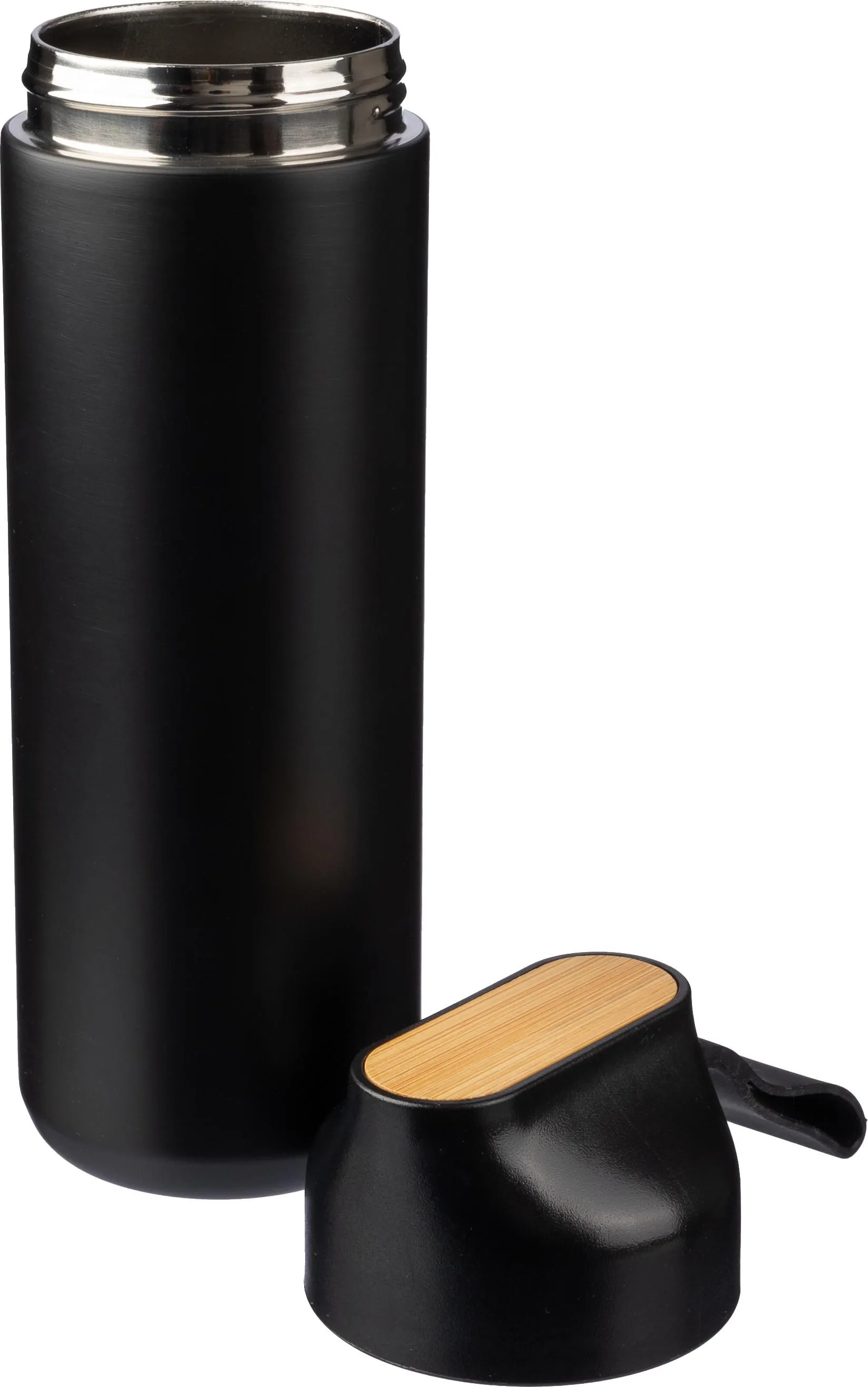 Black carton gift box including 3 items: a stainless steel vacuum-insulated double-walled drinking bottle (640 ml) with a PP lid, silicone strap, and bamboo detail on the top. The inside is stainless steel 304, the outside stainless steel 201