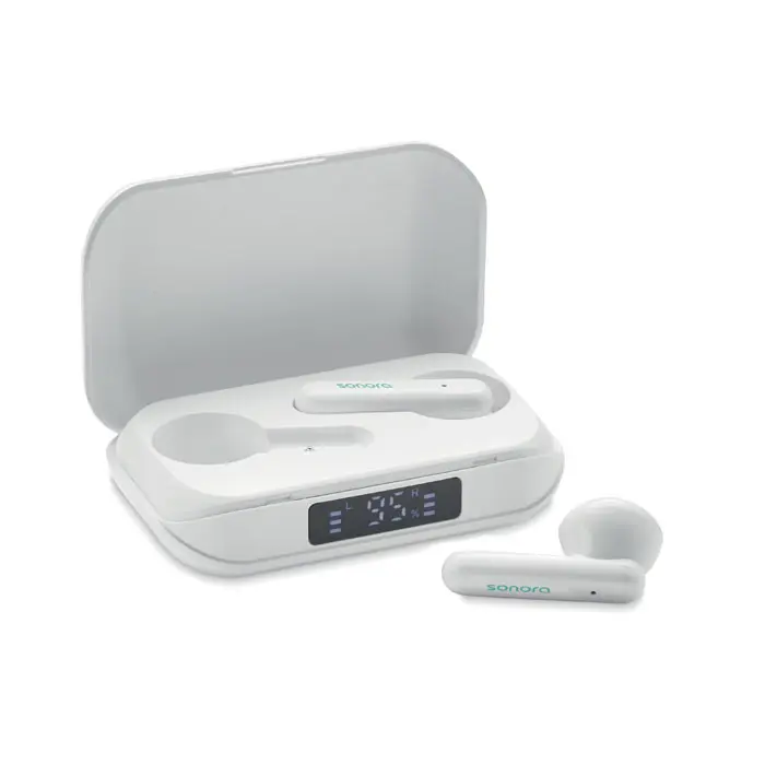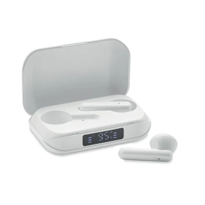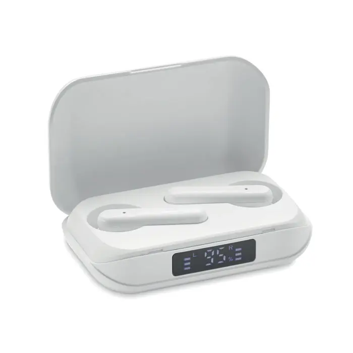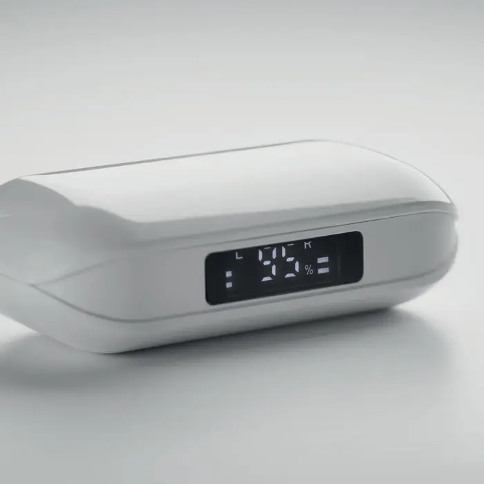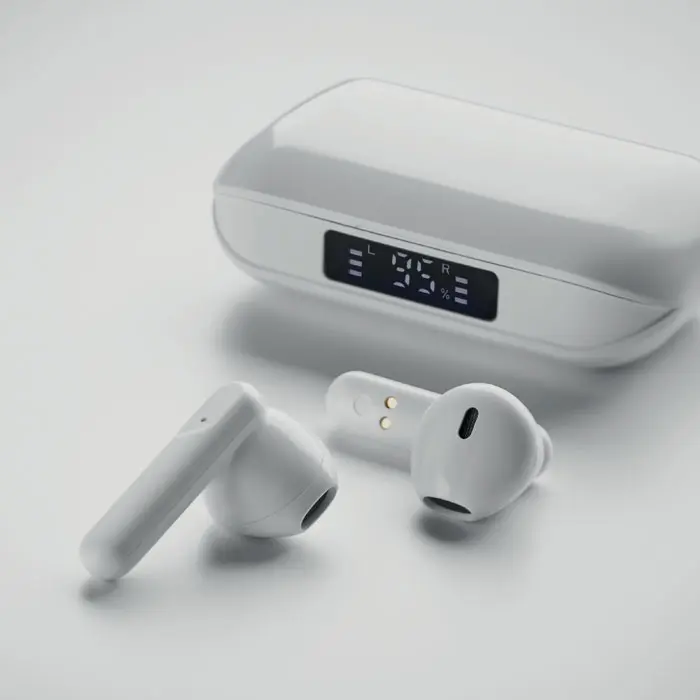 €10.01ABS True Wireless Stereo (TWS) 5.3 bežične stereo slušalice s mikrofonom i baterijom od 30 mAh. Vrijeme reprodukcije otprilike 3 sata. Posjeduju LCD zaslon za prikaz razine napunjenosti. Automatsko spajanje. Uključuje kabel za punjenje tipa C i stanicu za punjenje od 250 mAh.