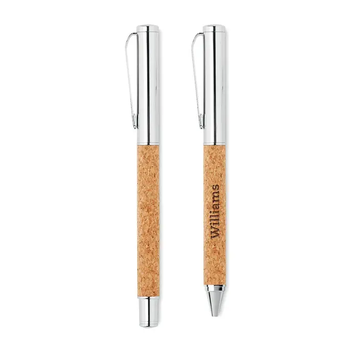 €4.13Set metalnih olovaka s kemijskom olovkom (okretni mehanizam) i roller olovkom (skida se poklopac) s cijevi od pluta u kutiji od pluta plava i crna tinta plut je prirodan materijal pa može doći do odstupanja u tisku
