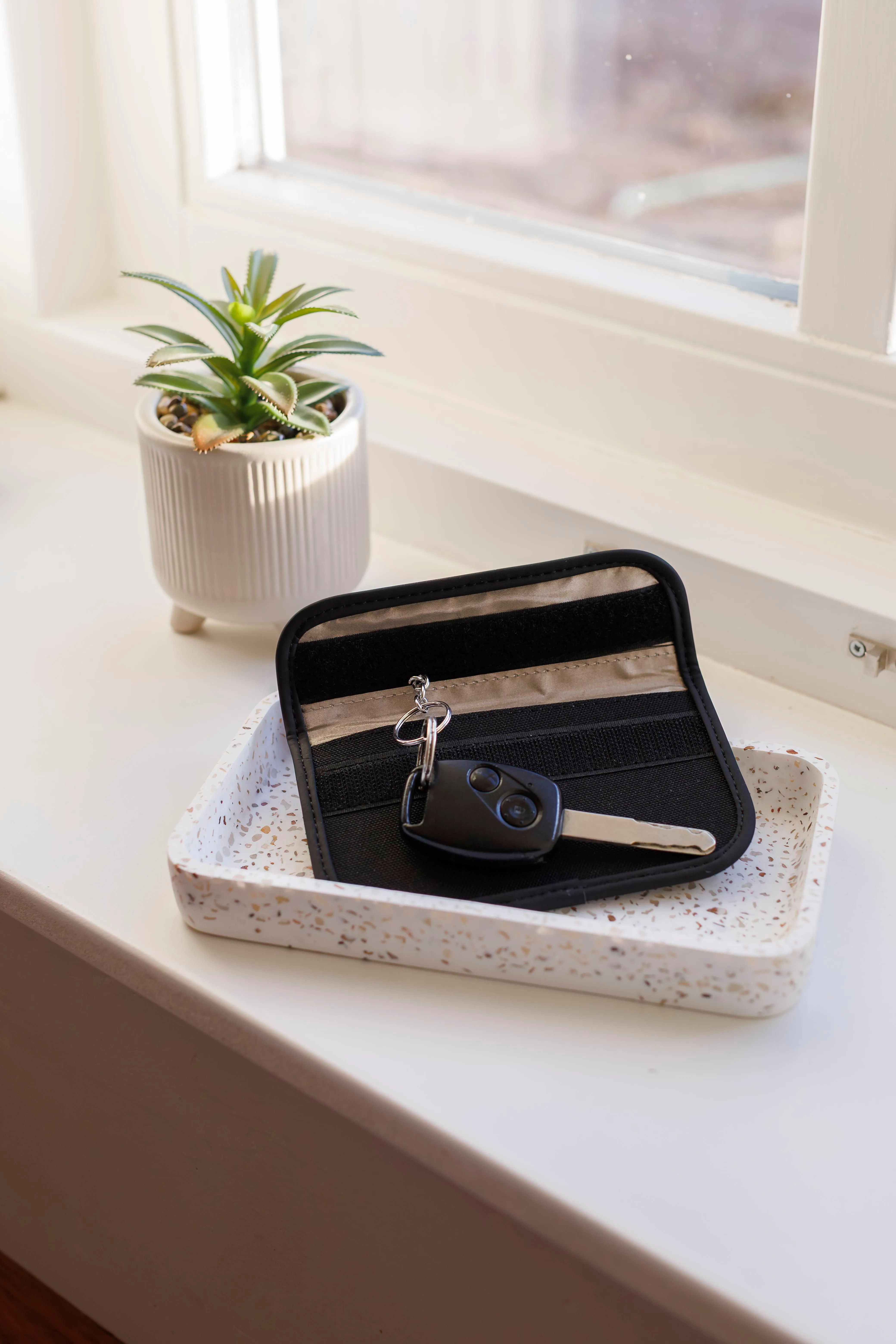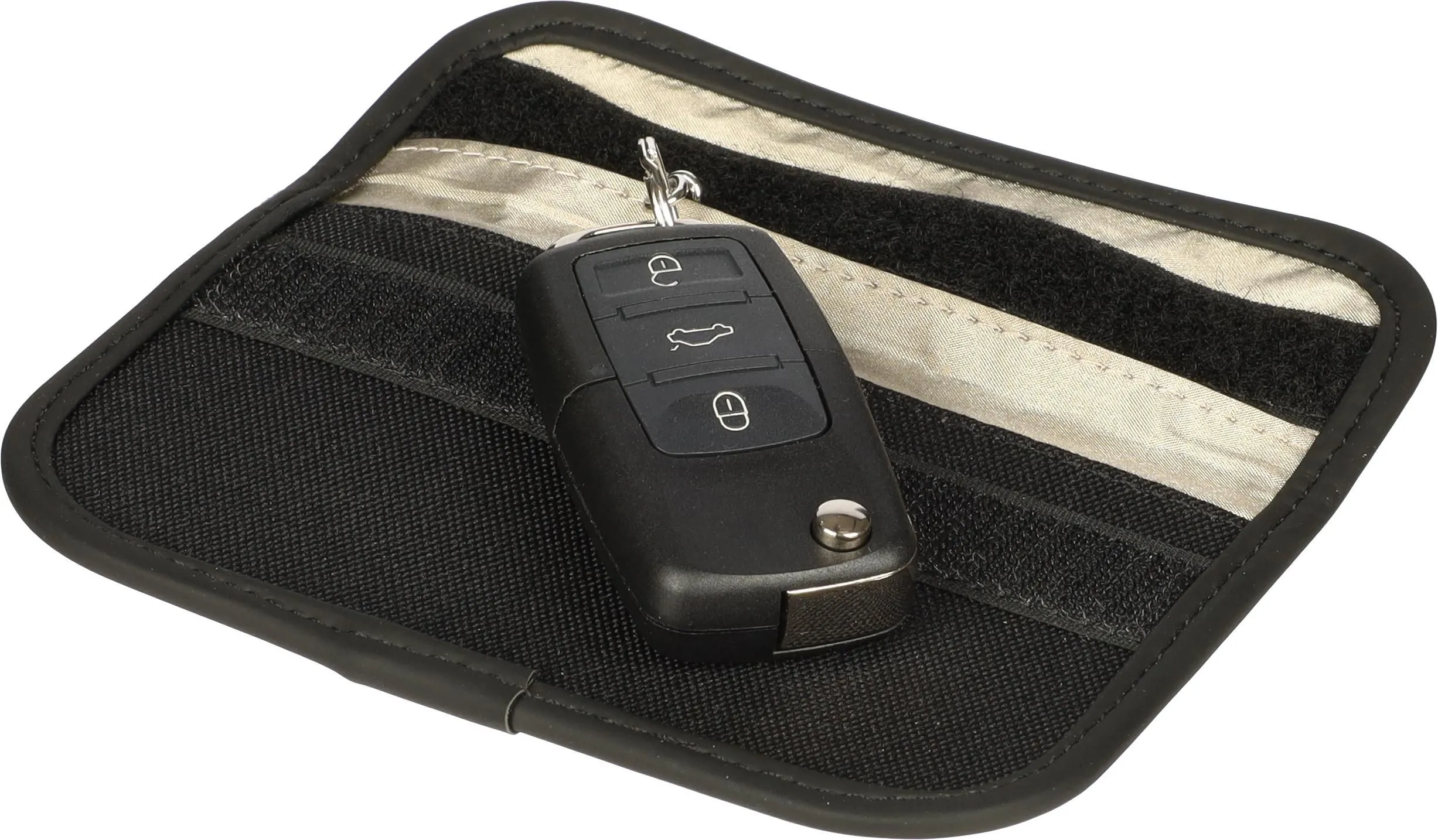 600D polyester and pouch with Velcro closure, designed for keys and cards. Made with recycled PET (rPET) and PU, a flexible, cushioning material, reducing waste while delivering the same strength and durability. Features integrated RFID protection to prevent skimming or unauthorized access to keys. Includes an internal keychain for secure storage and a Velcro flap. Made from rPET material for a more sustainable choice.