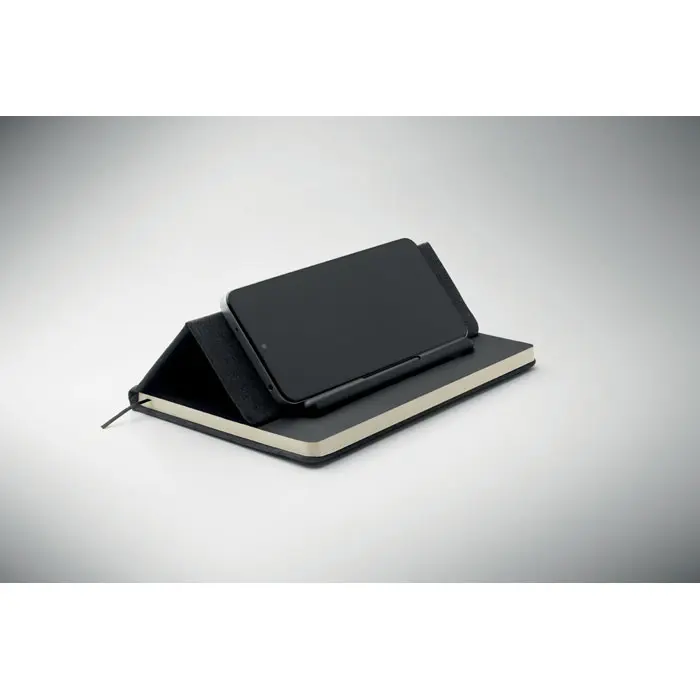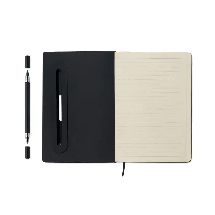 €2.76A5 bilježnica s tvrdim RPET koricama i funkcijom držača za telefon, integrirana 2-u-1 olovka bez tinte i obična kemijska olovka u ABS-u, uvezana, 192 reciklirane linirane stranice (96 listova), odgovarajuća traka za zatvaranje i oznaka, FSC® certifikat | FSC MIX CREDIT, P7.1, FSC-C213206
