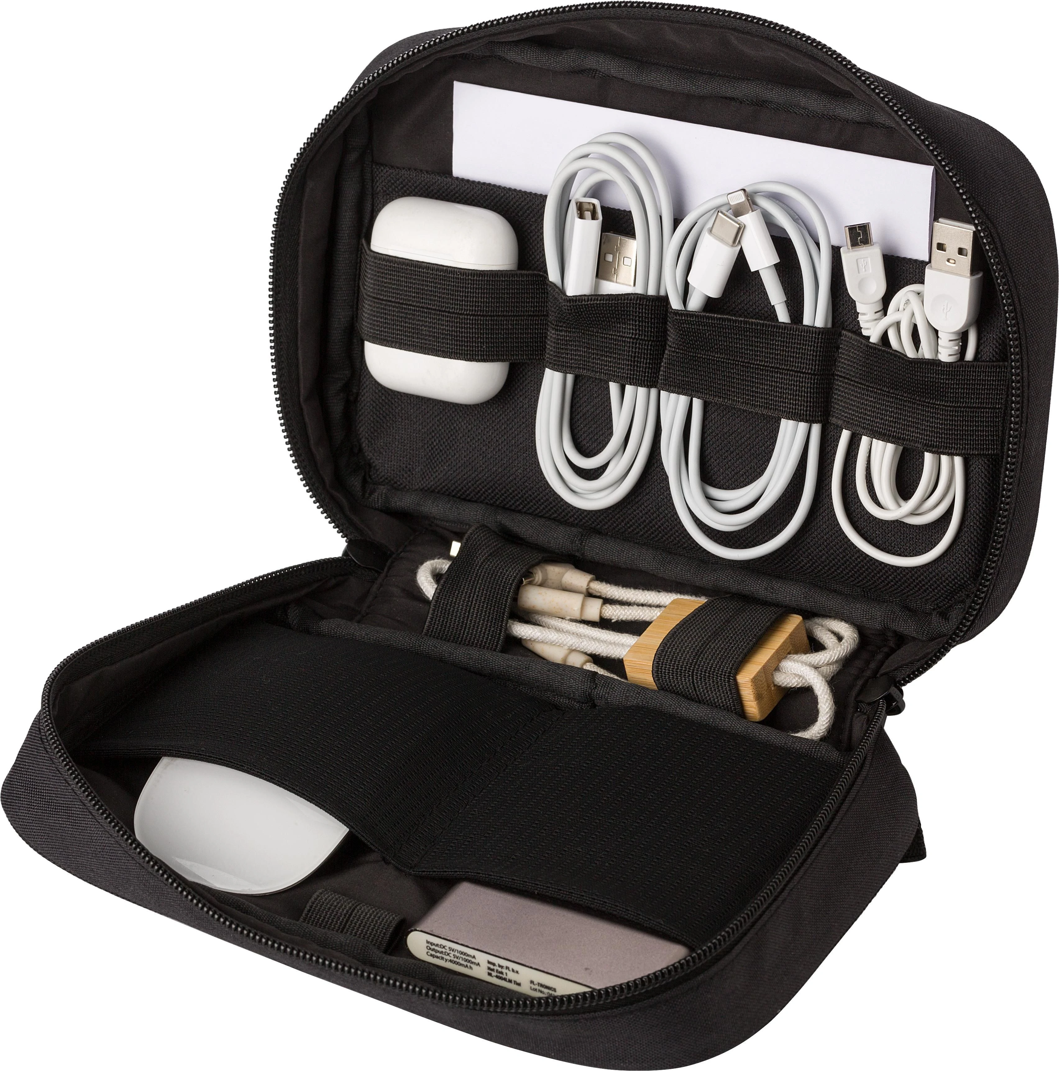 €8.84rPET 300D polyester travel pouch. One compartment with multiple pockets for carrying cables and travel documents. With Velcro-closing front pocket. Including rPET label.
