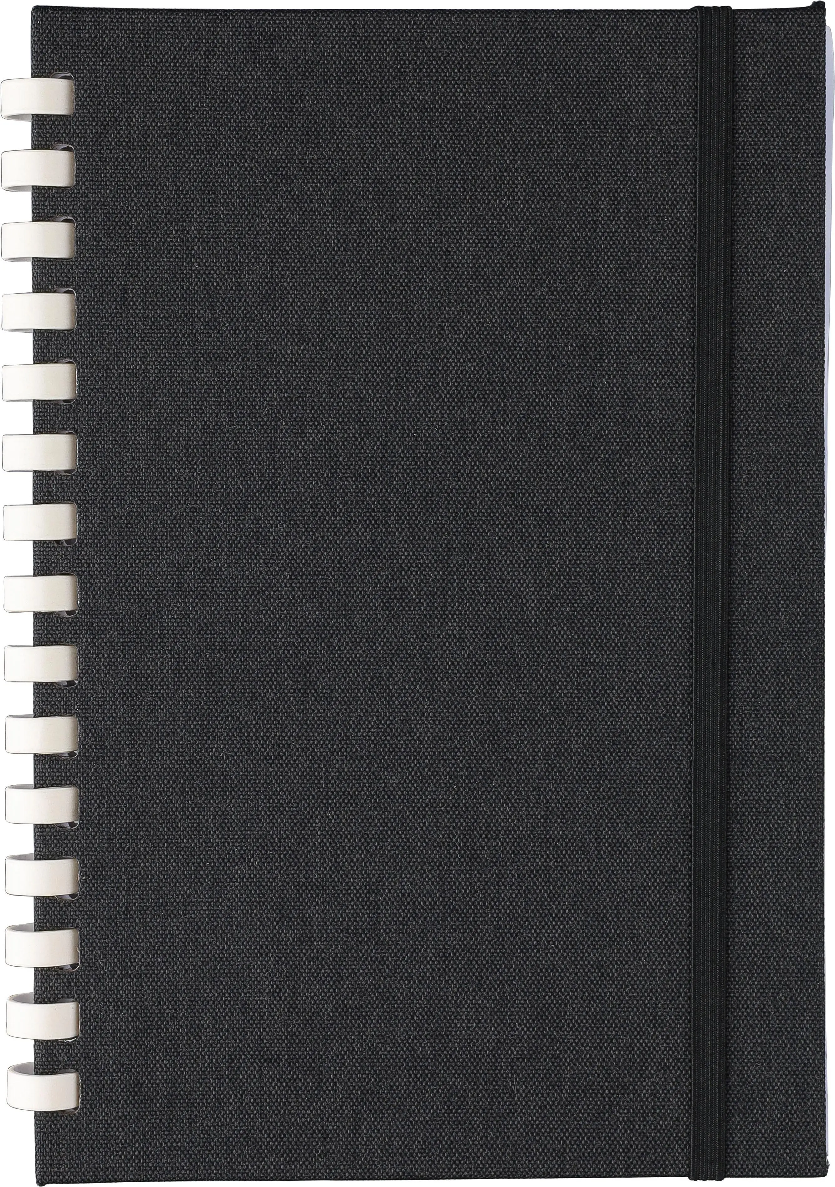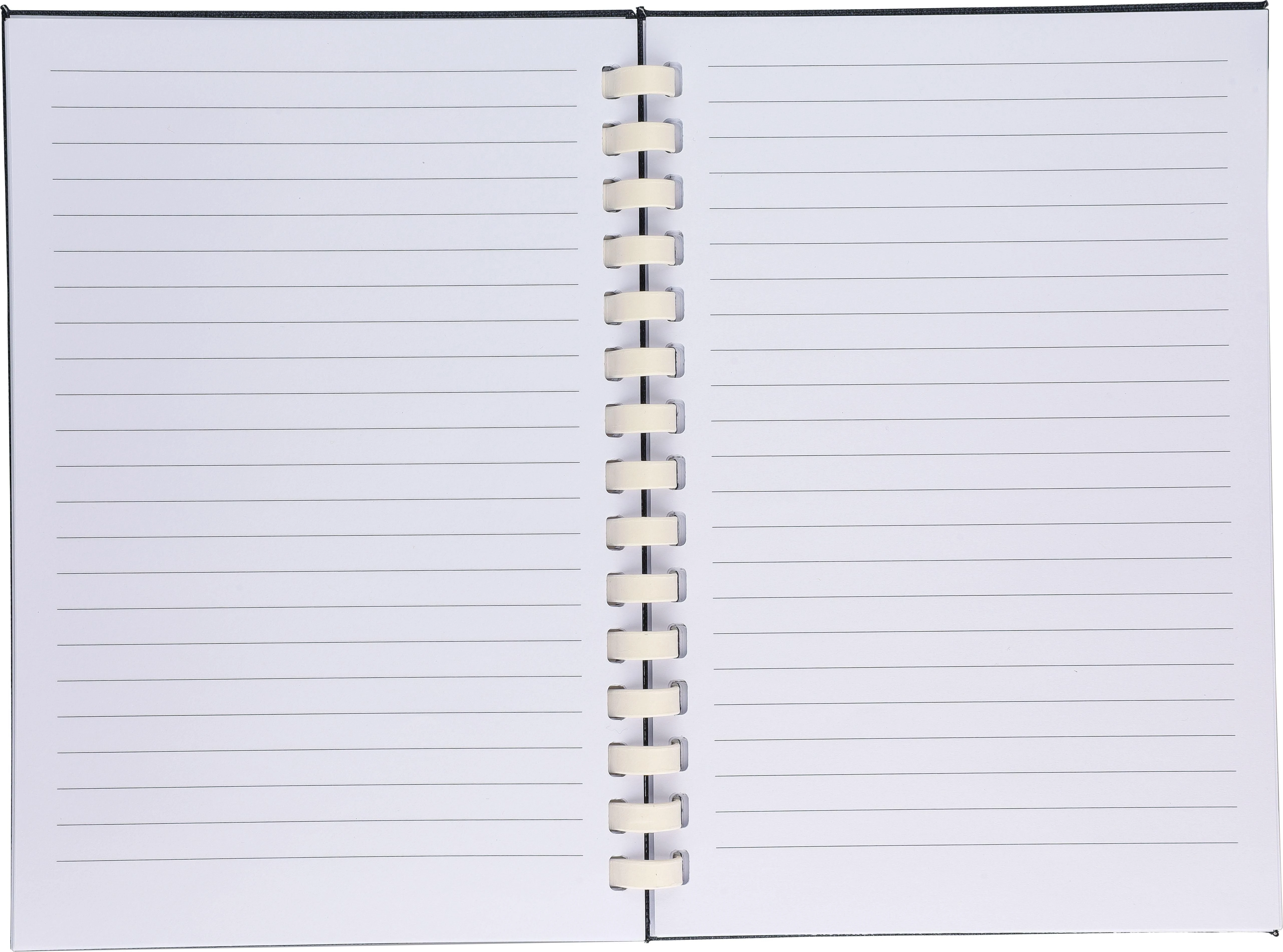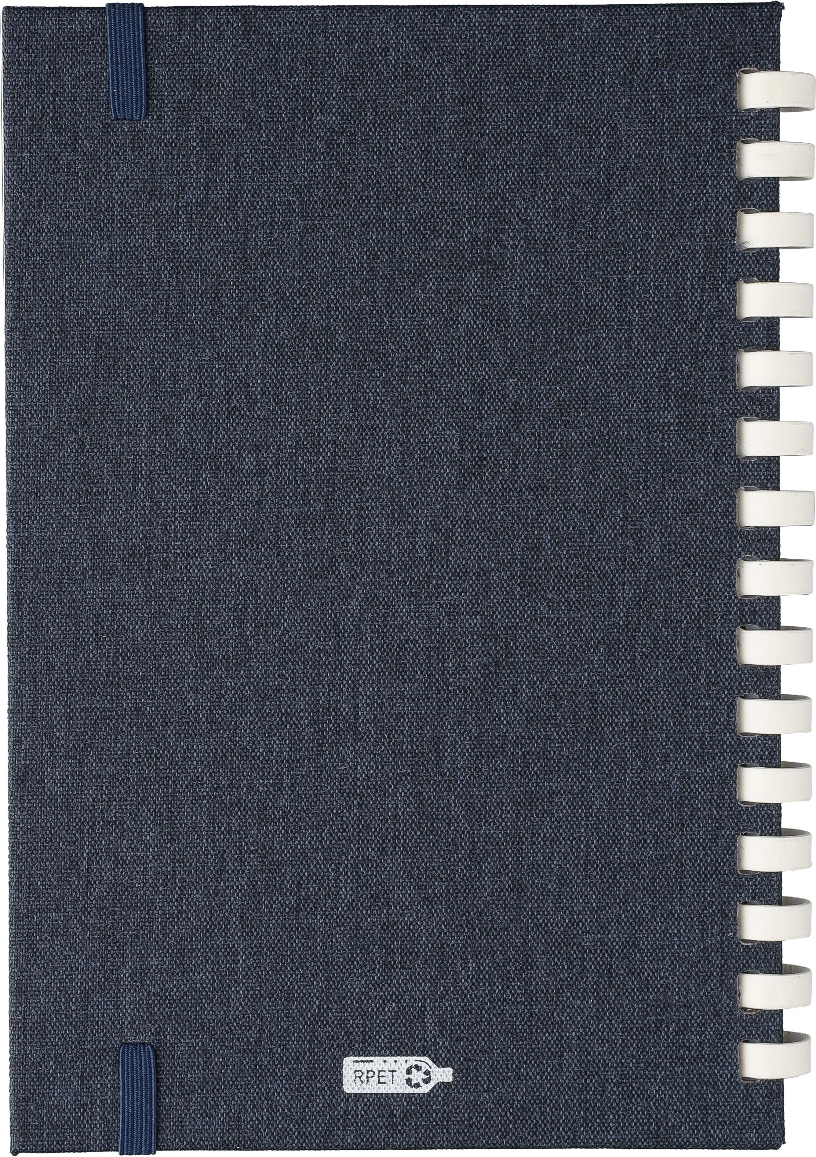 RPET bilježnica približno A5 formata s tvrdim koricama i elastičnom trakom za zatvaranje, bijela kartonska spirala s 15 prstena, oznaka za stranicu, 80 listova papira 70 g/m² s crtama, RPET logo na stražnjoj strani, omotana u papir bez plastične vrećice