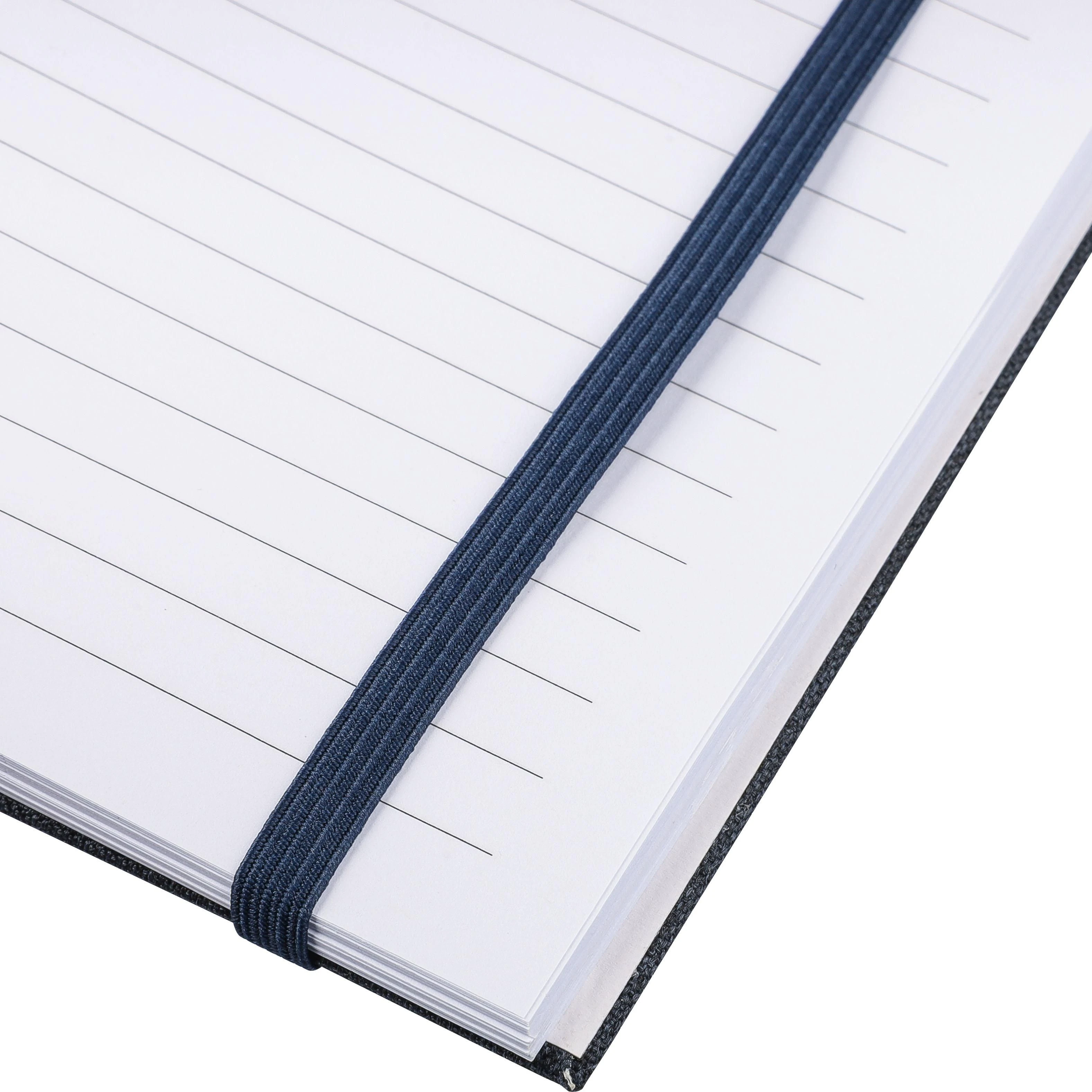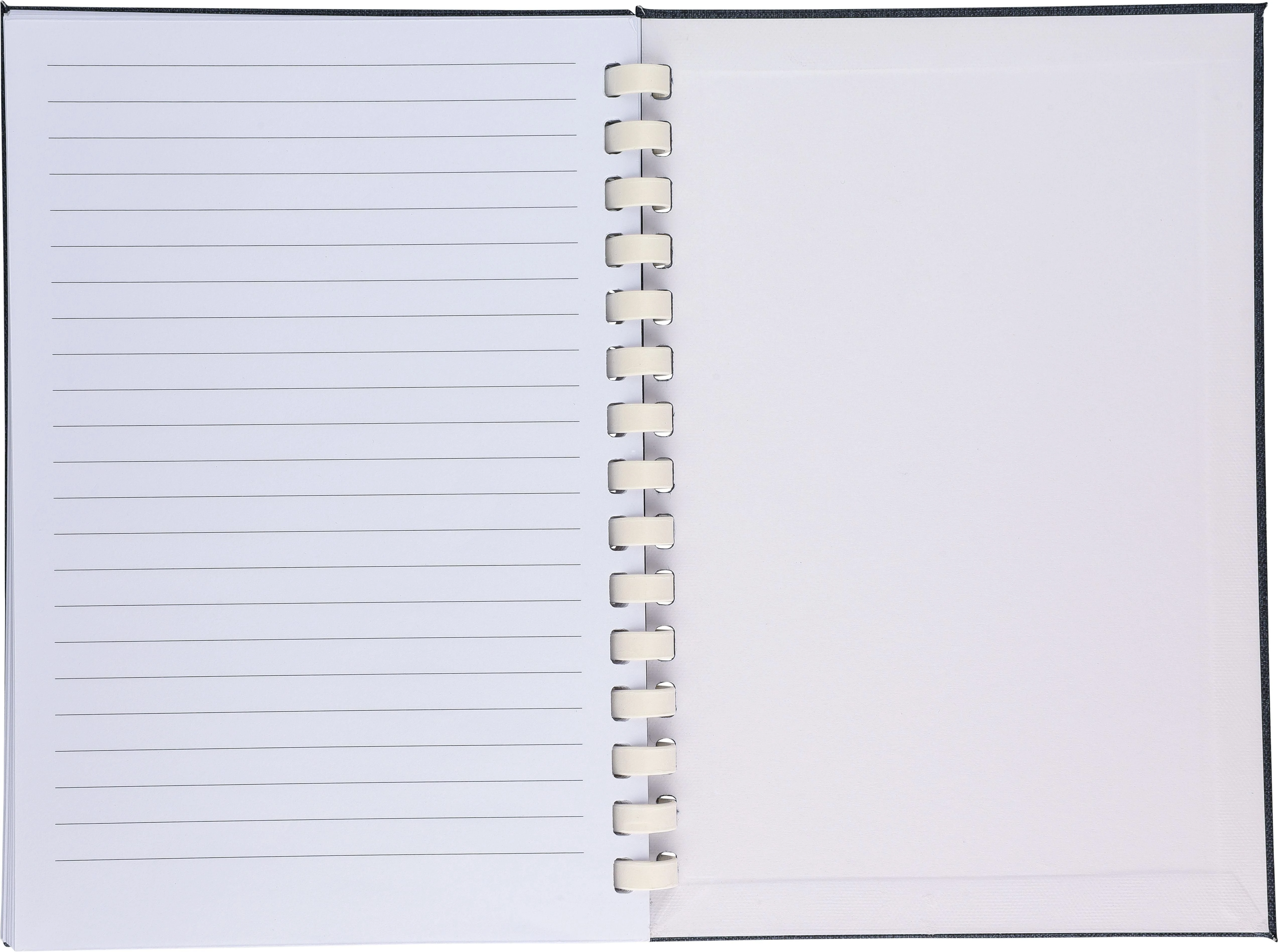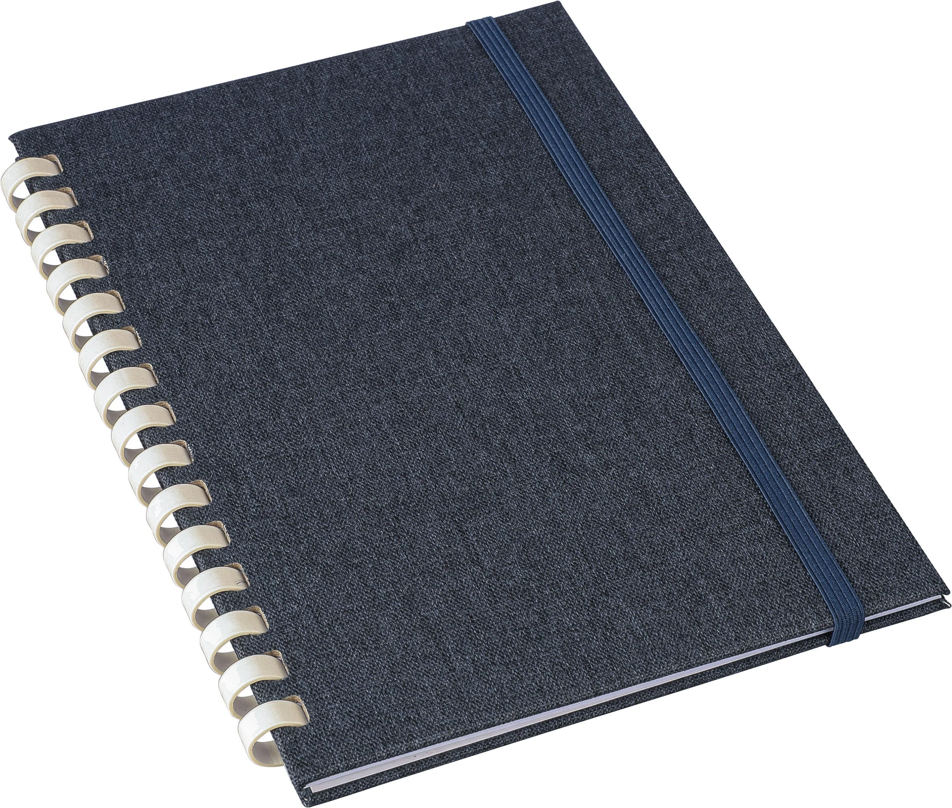 RPET bilježnica približno A5 formata s tvrdim koricama i elastičnom trakom za zatvaranje, bijela kartonska spirala s 15 prstena, oznaka za stranicu, 80 listova papira 70 g/m² s crtama, RPET logo na stražnjoj strani, omotana u papir bez plastične vrećice