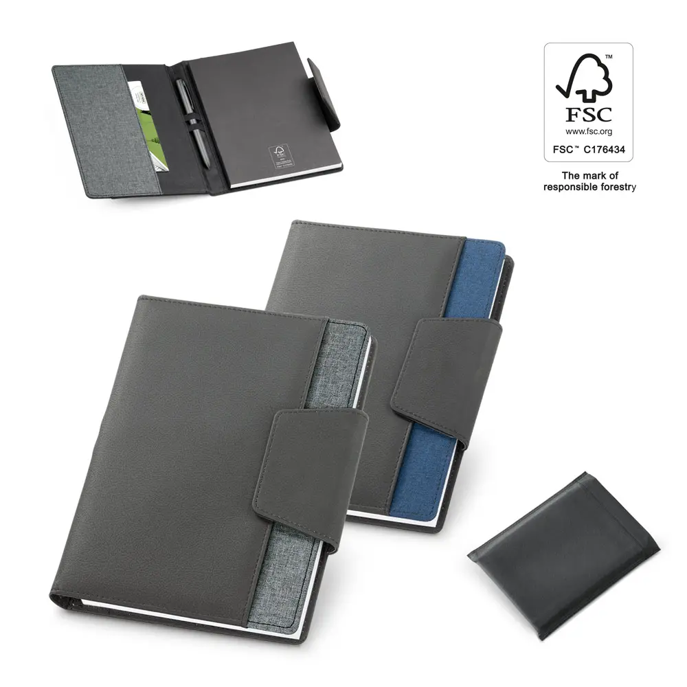 €8.34Mapa od PU i poliestera s A5 blokom, magnetsko zatvaranje, vanjski džep, unutarnji džep i držač za olovku (olovka nije uključena), blok sadrži 160 praznih stranica (70 g/m²) od FSC™ certificiranog materijala i drugih kontroliranih materijala, isporučuje se u netkanoj vrećici, dimenzije 155 x 215 mm, vrećica 205 x 250 mm