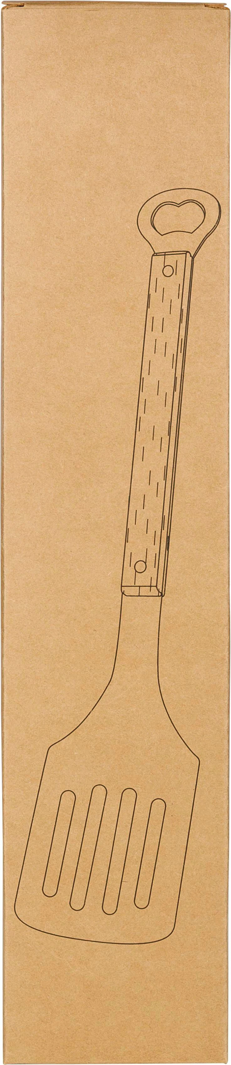 Lopatica za roštilj od nehrđajućeg čelika s drškom od bukve i integriranim otvaračem za boce na kraju, pojedinačno pakirana u smeđu kartonsku kutiju