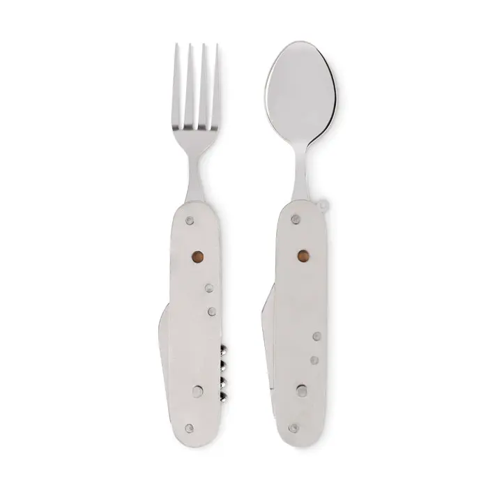Višenamjenski sklopivi set pribora za kampiranje od metala u drvenom kućištu, 5 funkcija: vilica, žlica, otvarač za konzerve, vadičep i nož, dijelovi se mogu odvojiti u 2 dijela
