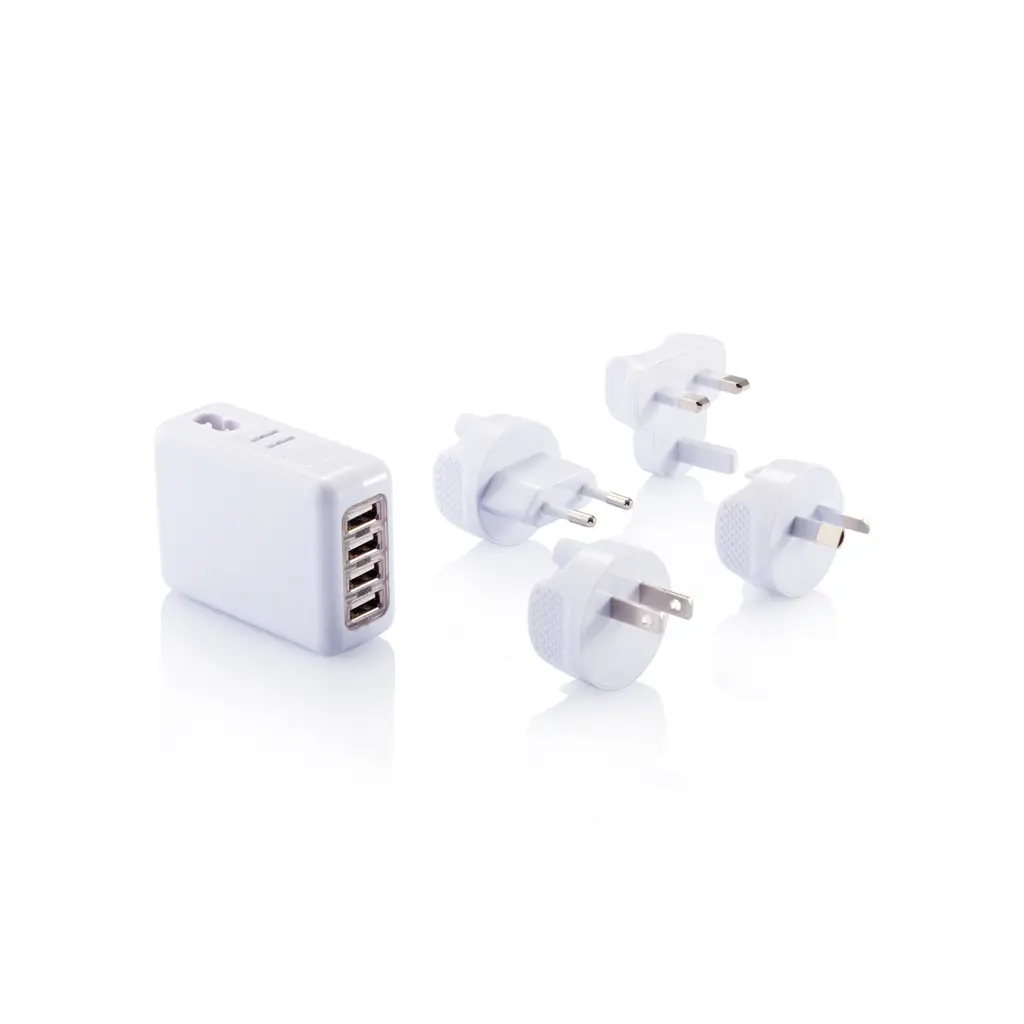 Prijenosni USB putni adapter s 4 priključka za punjenje uređaja, izlaz 3,1A omogućuje istovremeno punjenje više uređaja, AC max 240V/350mA, USB max 5,25V/3,1mA DC, dolazi s četiri različita adaptera, pakirano u vrećici