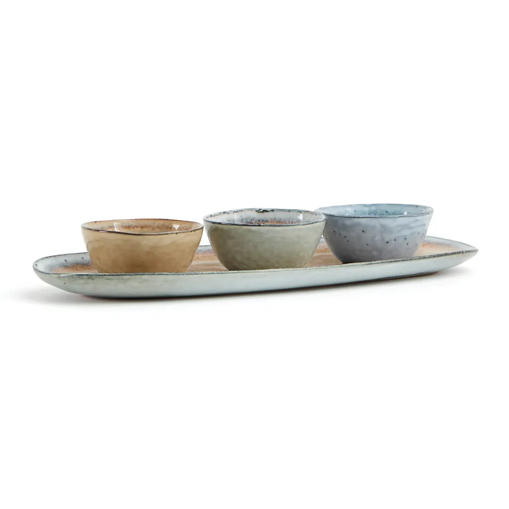 Poslužavnik od kamenine s tri male zdjele. Neograničene mogućnosti: tapasi, umaci ili grickalice. Sam poslužavnik je odličan za serviranje salata ili kanapea. Nomimono crpi inspiraciju iz prirode i zemlje oko nas, stvarajući ovu rustikalnu liniju u prirodnim zemljanim tonovima gdje nijedan predmet nije isti. Japansko susreće skandinavsko, rustikalno susreće moderno. Kolekcionarski predmeti za jednostavno i inspirativno posluživanje. Svaki predmet je ručno izrađen i jedinstven. Svaki predmet je glaziran tri puta kako bi se postigla prava vrsta završetka. Sigurno za upotrebu u perilici posuđa i mikrovalnoj pećnici.