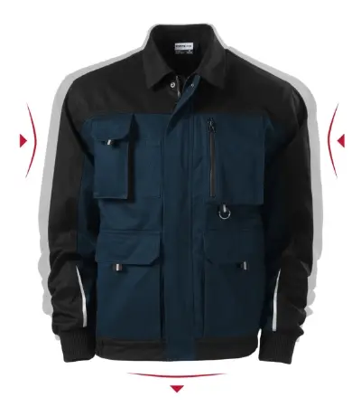 patentni zatvarač u punoj dužini s preklopom, nabori na stražnjem dijelu, 8 multifunkcionalnih džepova, džepovi s naborima s preklopom i džepovi s patentnim zatvaračem, rebrasti manšeti rukava s 3% elastana, donji rub s elastičnom trakom, metalni D-prsten i karabiner za ključeve i ID kartice, dvostruki šavovi za dodatnu izdržljivost, retroreflektirajući elementi
