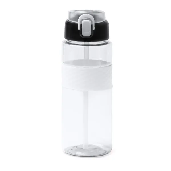 Bottle with a body made from RPET, with a capacity of 700 ml. Features a dispenser with a silicone straw and an automatic-opening lid activated by pressing the front button. Features a safety lock in the lid. Features a carry handle and a textured silicone band around the body for easy grip.
